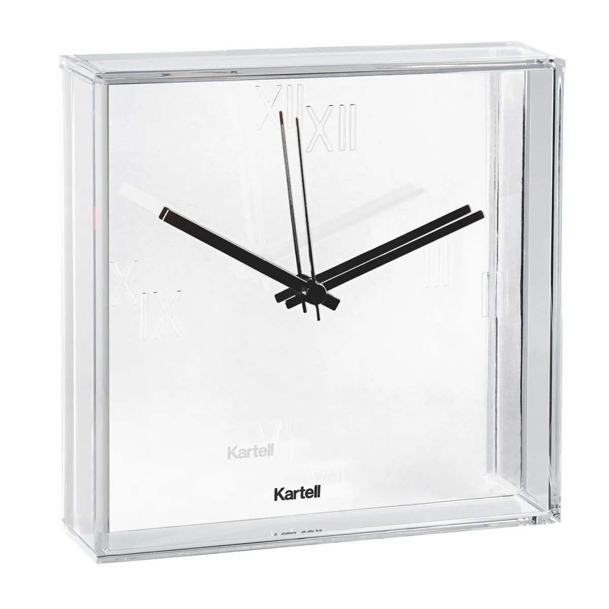 Kartell zählt die Stunden und präsentiert mit Tic & Tac seine erste Wanduhr. Stardesigner Philippe Starck hat Tic & Tac als eine transparente quadratische Box mit eingravierten römischen Zahlen auf der Aussenfläche gestaltet, die im Inneren ein flach geformtes Ziffernblatt einschliesst.