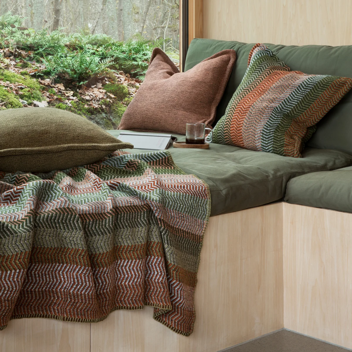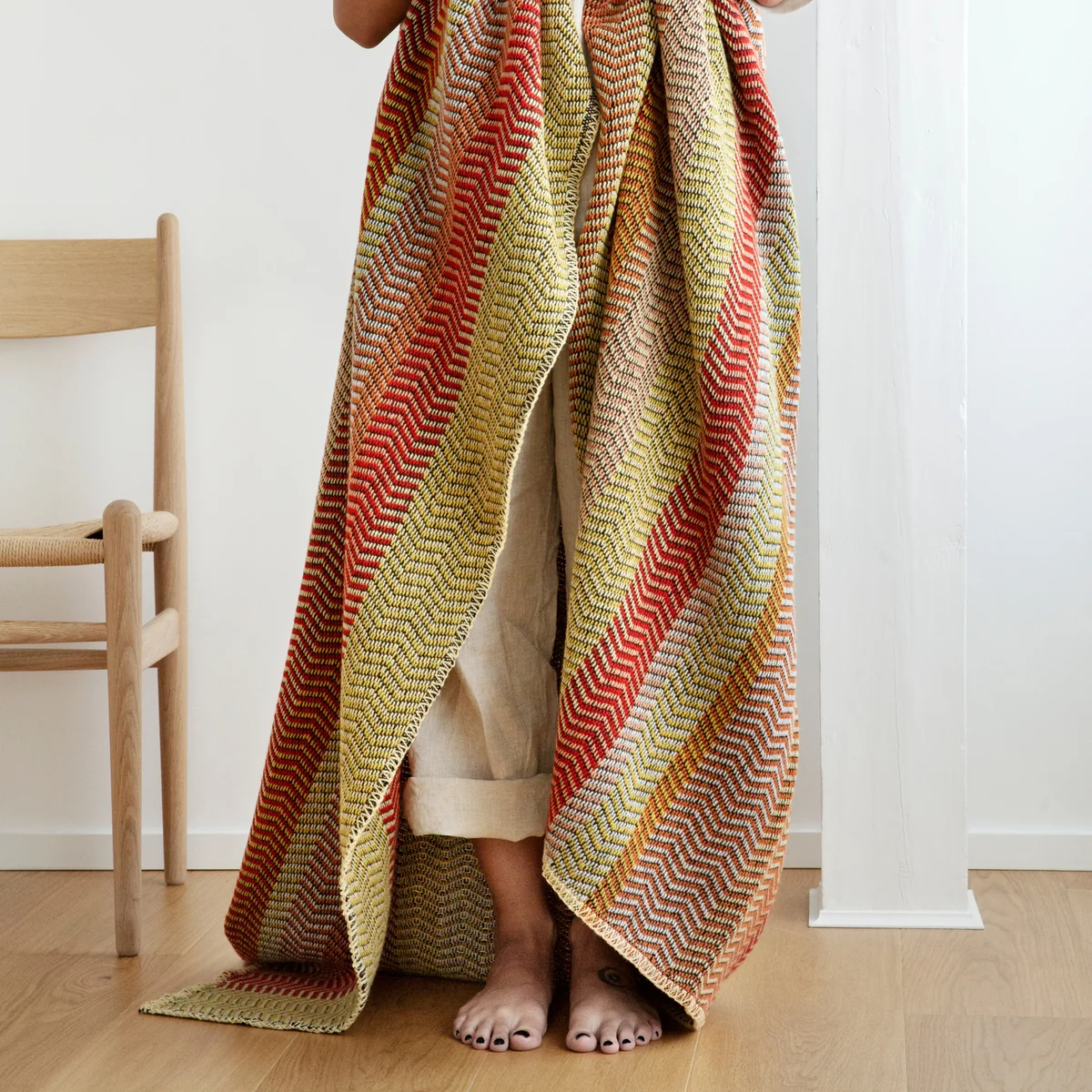 Die Fri Decke von Anderssen & Voll für Røros Tweed erinnert mit seinen Farben an den späten Herbst. Die Lammwoll-Decke darf ausnahmslos per 30 Grad Handwäsche gereinigt werden. Die Fri Kollektion wurde von traditionellen Läufern inspiriert, von welchen es unendliche viele Variationen in fast jeder Berghütte Norwegens zu finden gibt. Bei dieser Neuinterpretation löst sich der typische repetitive Farbrhythmus etwas auf und die Farben verändern sich zu einem weichen und gewundenen Zickzack. Die Decke ist in unterschiedlichen Farben erhältlich.