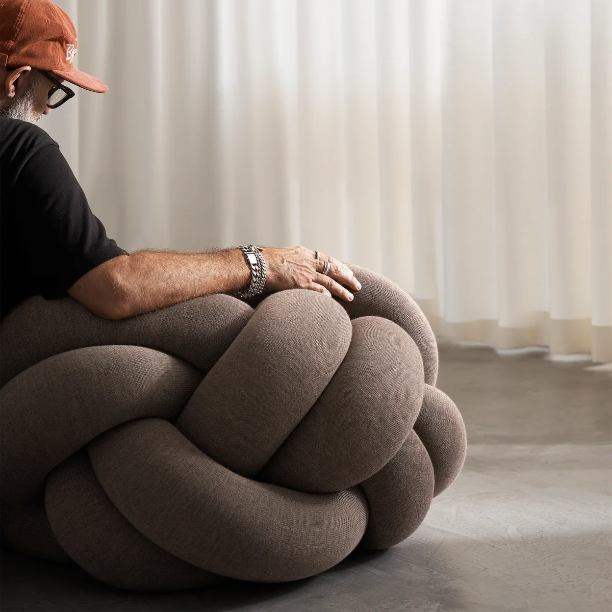 Man kann sich an Knot XL anlehnen, auf dem Kissen sitzen, sich auf ihm entspannen und mit Knot XL Hierarchien aufbrechen, wenn man sich unterhält. Das Kissen ersetzt oder ergänzt jedes Sofa oder jeden Loungesessel, ist ein entspanntes Möbelstück zu Hause, in einem lebendigen Büro und in jedem informellen öffentlichen Raum. Und wenn es nicht gebraucht wird, kann das Kissen als Dekoration im Raum genutzt werden. Man kann es sogar für Yoga verwenden, eine von Ragnheidurs persönlichen Lieblingsbeschäftigungen.