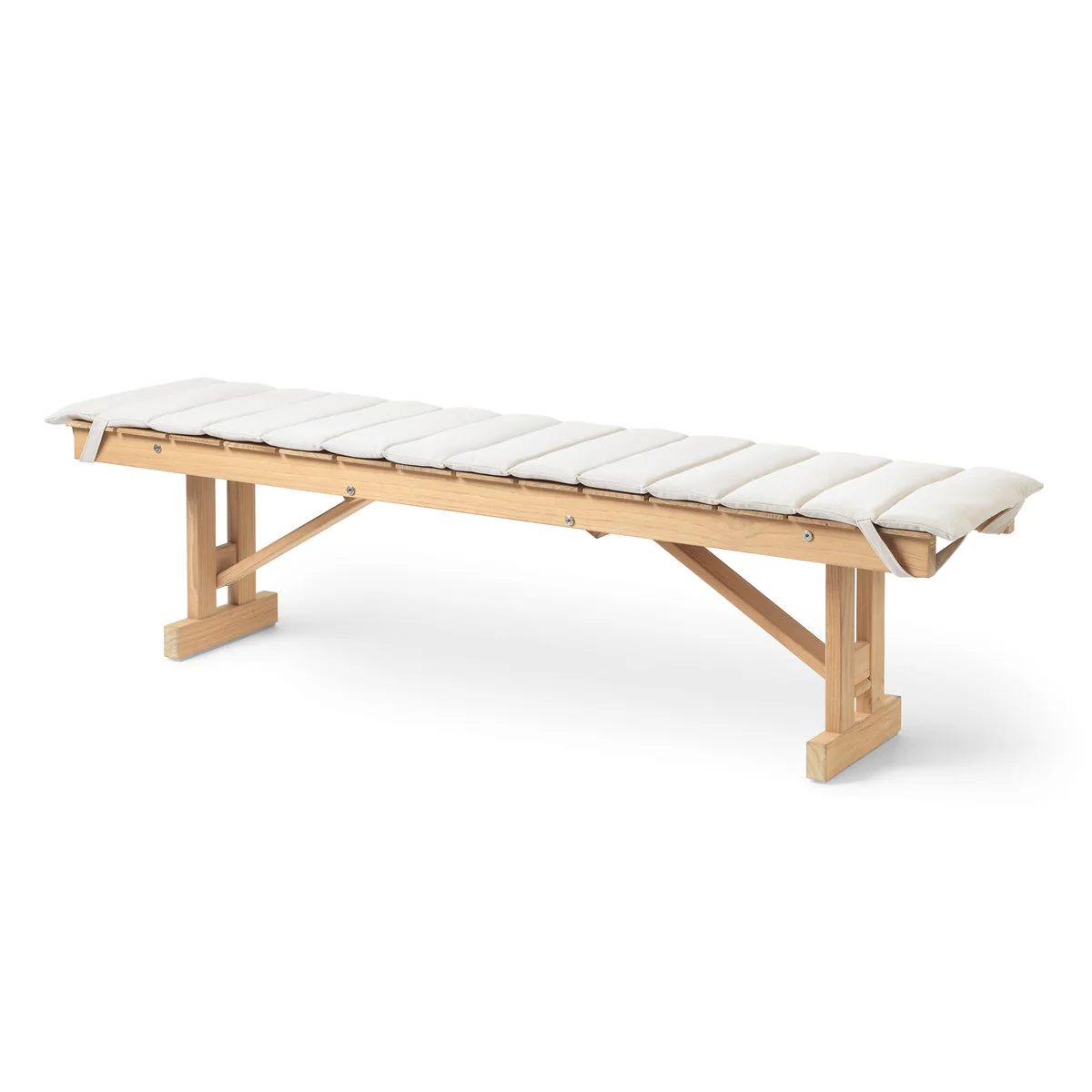 Die Sitzauflage für die BM1871 Bank von Børge Mogensen für Carl Hansen macht die Bank für den Aussenbereich noch komfortabler. Die Auflage wird mittels Gummibändern an der Bank befestigt und trotzt so auch einer stärkeren Windböe.