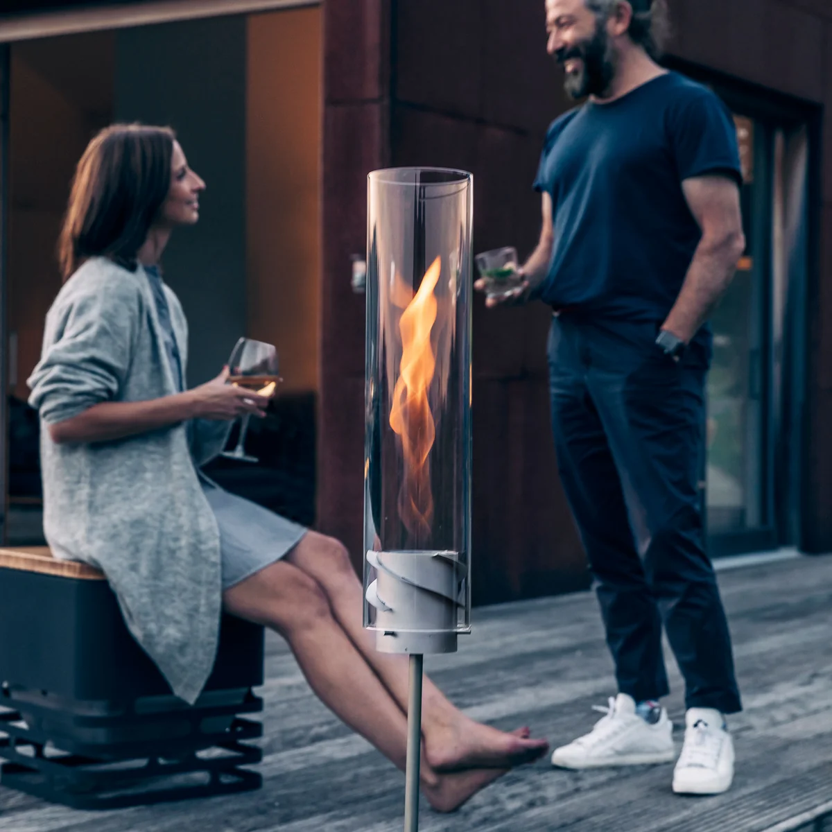 Mit dem Fuss lässt sich die Spin Fackel in ein Tischfeuer verwandeln. Einfach Spiel gegen den Fuss austauschen und schon entsteht ein gemütliches Feuer auf dem Gartentisch.