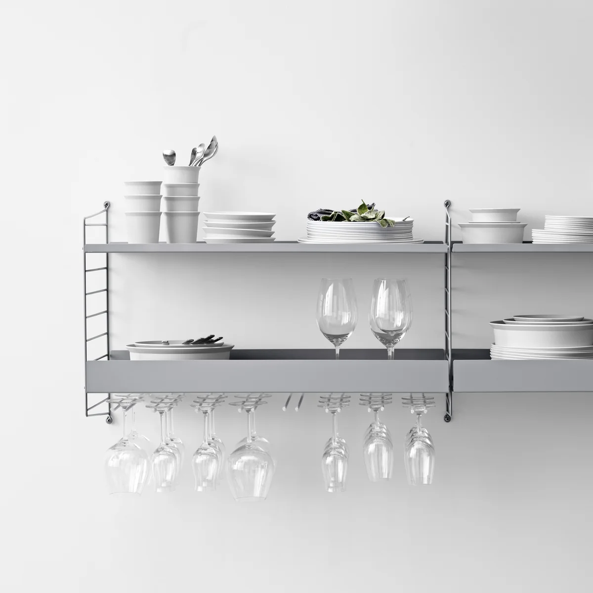 Mit dem Hanger Rack Modul für Weingläser lässt sich String beispielsweise hervorragend in die Küche integrieren. Kopfüber werden die gewünschten Gläser dabei am Stiel zwischen die Metallgabeln gehängt.