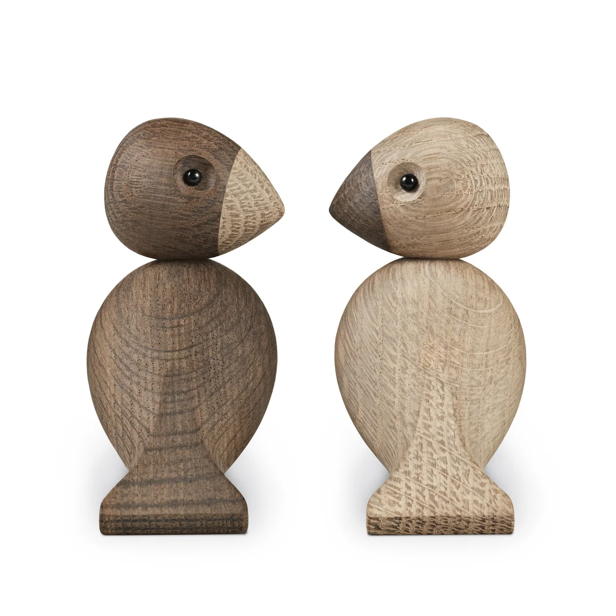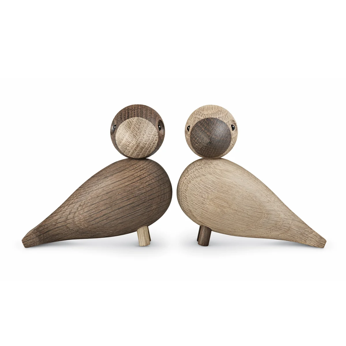 Die Unzertrennlichen von Kay Bojesen werden aus naturbelassenem und geräuchertem Eichenholz gefertigt. Die einheitliche Materialwahl signalisiert die starke Zusammengehörigkeit des Vogelpärchen, sorgt aufgrund der unterschiedlichen Behandlungsweise des Eichenholzes aber auch für Kontraste und Plastizität. Die - wie sollte es anders sein - im 2er-Set ausgelieferten Holzvögel sind sehr dekorativ und hochwertig verarbeitet. Dank der beweglichen Köpfe können die Unzertrennlichen unterschiedliche Positionen einnehmen und erhalten jeweils einen anderen Ausdruck. Sie eignen sich ausserdem als hervorragende Geschenkidee für Verliebte, zum Valentinstag, zur Hochzeit und zu anderen festlichen Anlässen.