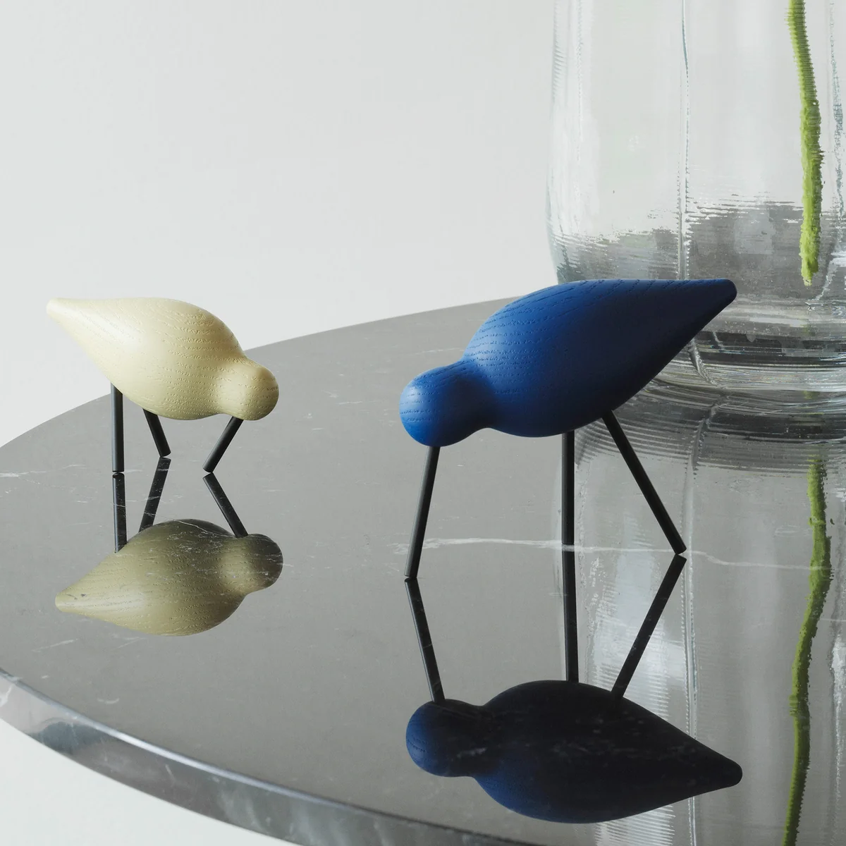 Der grosse Shorebird macht sich gut auf einem Regal, Sideboard oder auf einer Kommode. Dort kommt er neben Vasen und anderer Deko in seiner ganzen Schönheit zur Geltung. Die beiden kleineren Vögel von Normann Copenhagen lassen sich ideal als Gruppe aufstellen, in der die verschiedenen Grössen und Farben einen stilvollen und spielerischen Eindruck ergeben.