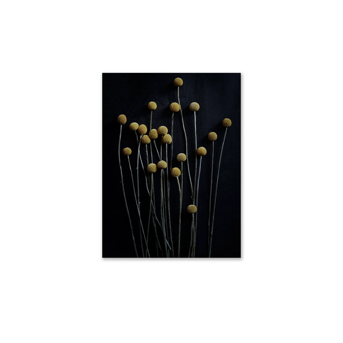 Die Craspedia Blumen, auch Trommelstöcke genannt, fotografierte die Künstlerin für Paper Collective auf einem schwarzen Hintergrund, der den sehr farbintensiven, runden Blüten eine mystische Ausstrahlung geben.