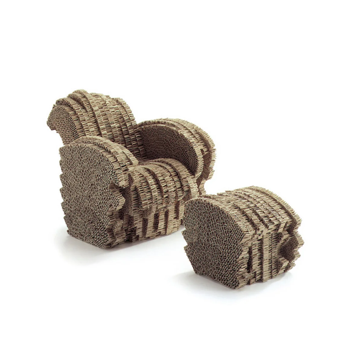 Kartonmöbel als preiswerte und leichte Alternative zu traditionellen Möbeln tauchen schon während der 60er Jahre auf. Die meisten Entwürfe zielten darauf ab, dem Karton die nötige Tragfähigkeit durch Steck- und Faltverbindungen zu verleihen. Gehry wählte ein anderes Verfahren, das massive Kartonmöbel, gleichsam Kartonskulpturen, entstehen liess: »Ich schaute eines Tages in meinem Büro auf einen Stapel Wellpappe – das Material aus dem ich Architekturmodelle zu bauen pflegte – und ich begann damit zu spielen, es zusammenzukleben und es mit einer Handsäge und einem Taschenmesser in Form zu schneiden«.