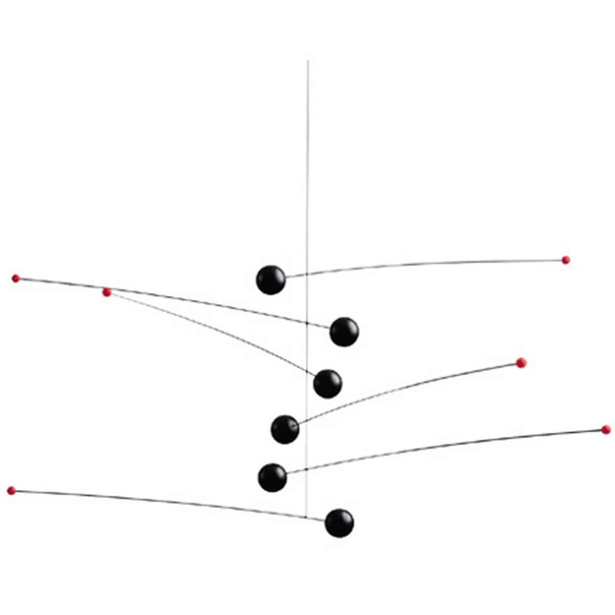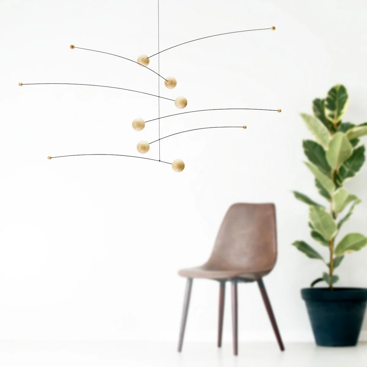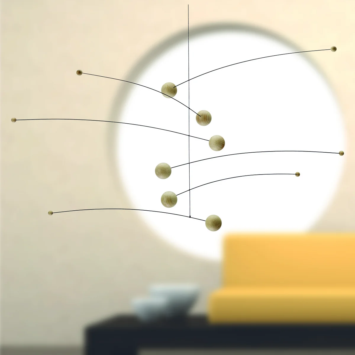 Das Mobile lässt Freiraum für Interpretationen: Sechs Planeten mit ihren Monden? Oder ein Symbol der hellen bzw. dunklen Seiten des Lebens?