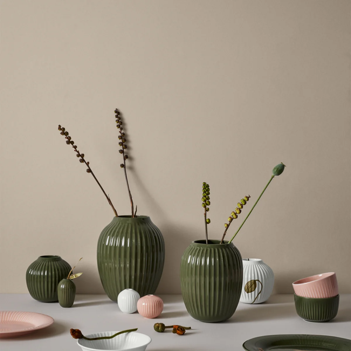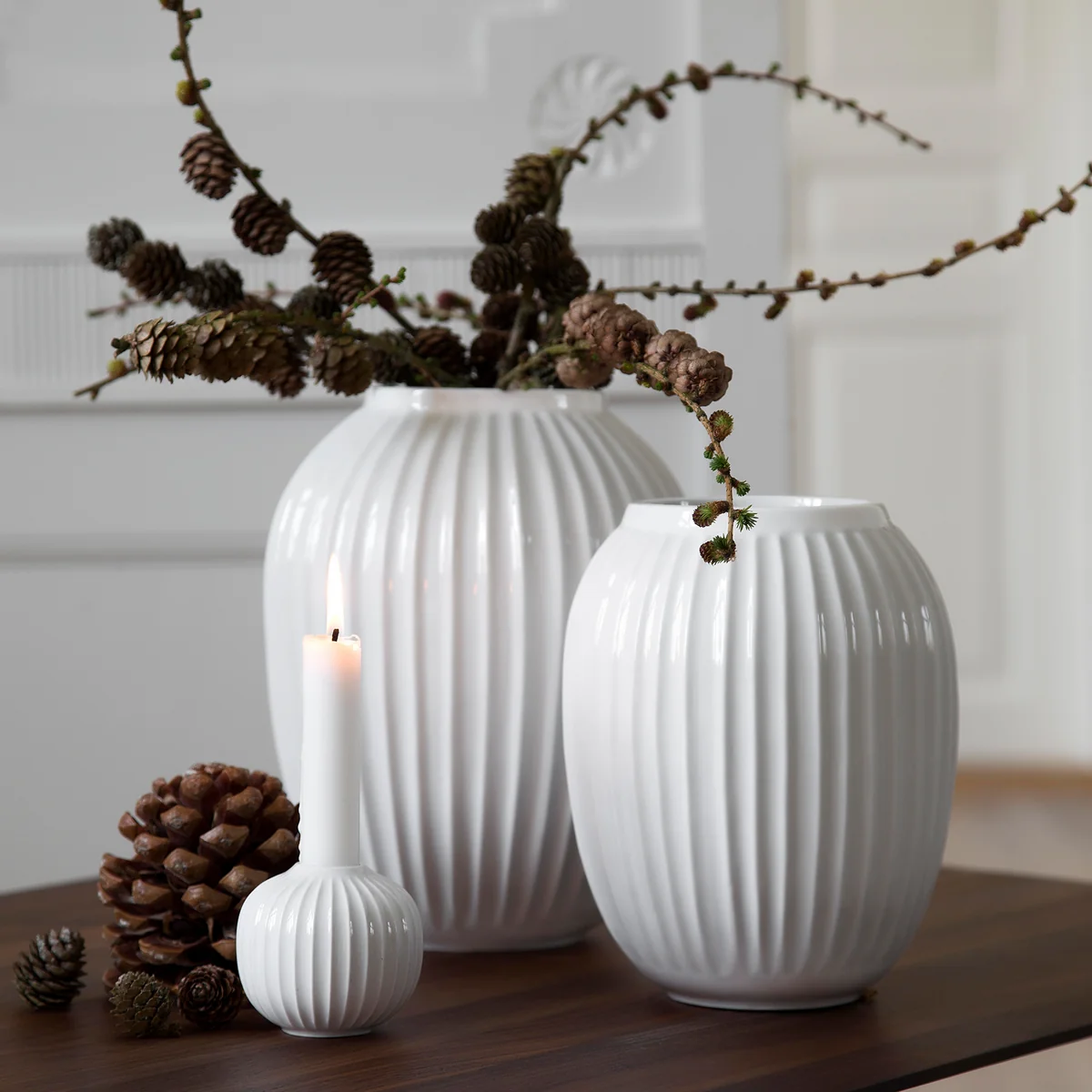 Die beeindruckenden Vasen von Kähler Design mit dem charakteristischen Rillenmuster gehören zu der Hammershøi Serie, die von Hans-Christian Bauer entworfen wurde. Für die Vasen und die gesamte Serie liess sich Bauer von den voluminösen Vasen von Svend Hammershøi inspirieren, die er bereits um 1900 in der Werkstatt von Kähler schuf.