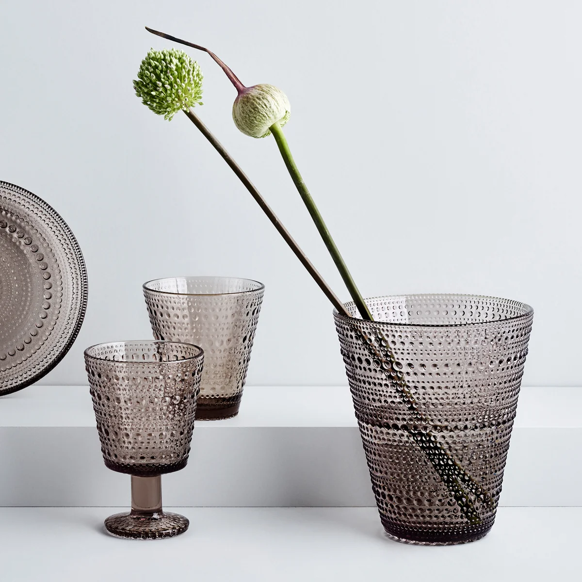 Das Kastehelmi Design wurde bereits 1964 von dem finnischen Glas-Designer Oiva Toikka entworfen und überzeugt seit jeher mit natürlicher Schönheit. Kastehelmi bedeutet übersetzt Tautropfen und beschreibt das Muster der Vase damit ausgesprochen gut: Wie kleine Wasserperlen legen sich die Tupfen gekonnt um das Glasgefäss und sorgen mit ihrer reflektierenden Oberfläche für einen echten Hingucker.