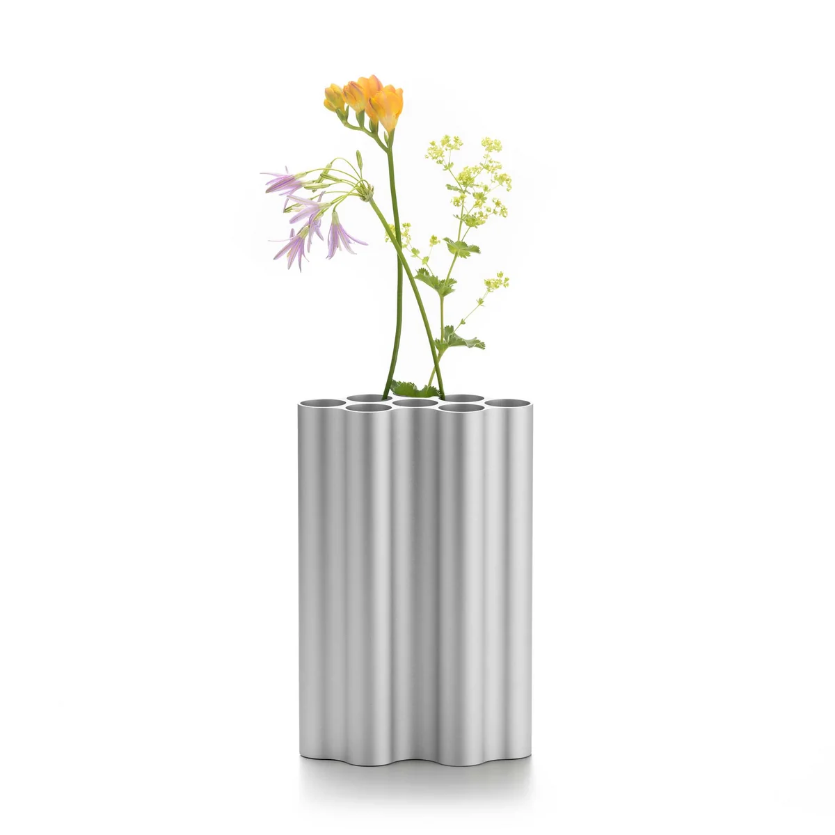 Für die Vase Nuage ziehen die Designer die Wolkenform aus massiven Aluminiumprofilen in unterschiedliche Längen. Die Grundform wird nun stehend verwendet, die Vase damit in acht einzelne Röhren unterteilt, in die Arrangements von Blumen und Gräsern eingestellt werden können. Die farbig eloxierten, wellenförmigen Oberflächen schaffen ein reizvolles Spiel von Licht und Schatten.