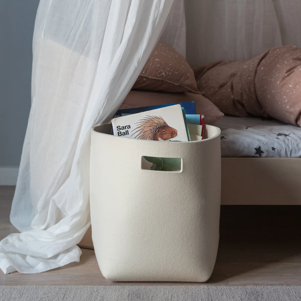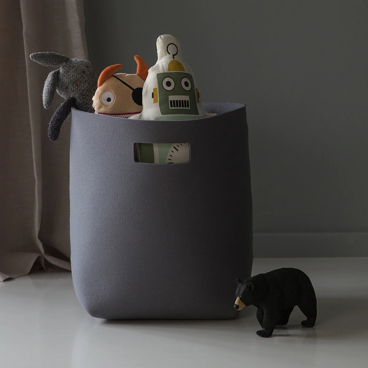 Der Papierkorb von Hey Sign kann dank des robusten, pflegeleichten und flexiblen Naturmaterials Filz auch als Aufbewahrungskorb für andere Dinge dienen, beispielsweise für Spielzeug oder andere kleine Utensilien. Dank der Henkel lässt sich der Papierkorb von Hey Sign mit einer Hand transportieren, wenn sein Inhalt umziehen soll.
