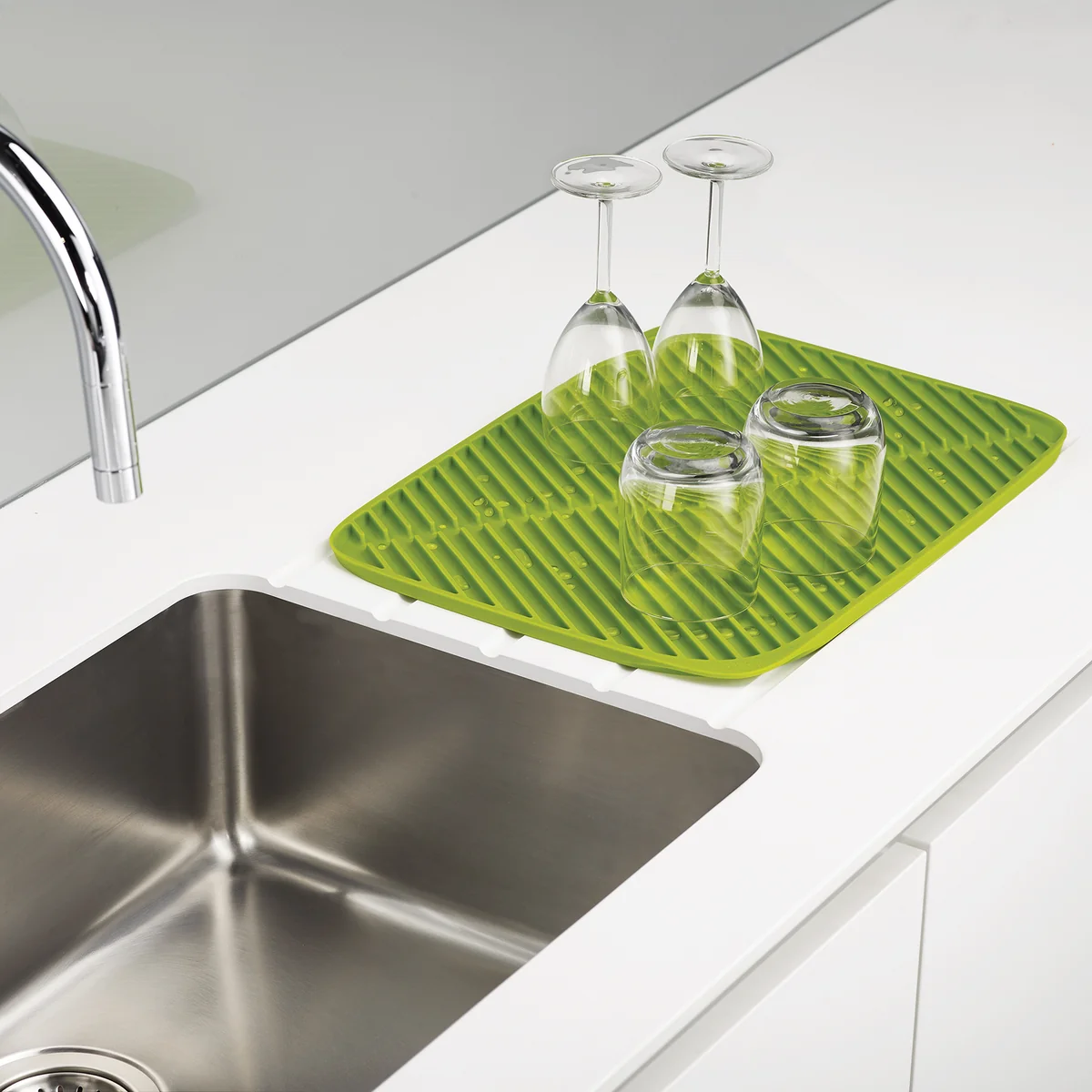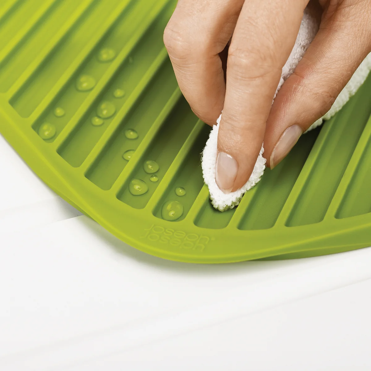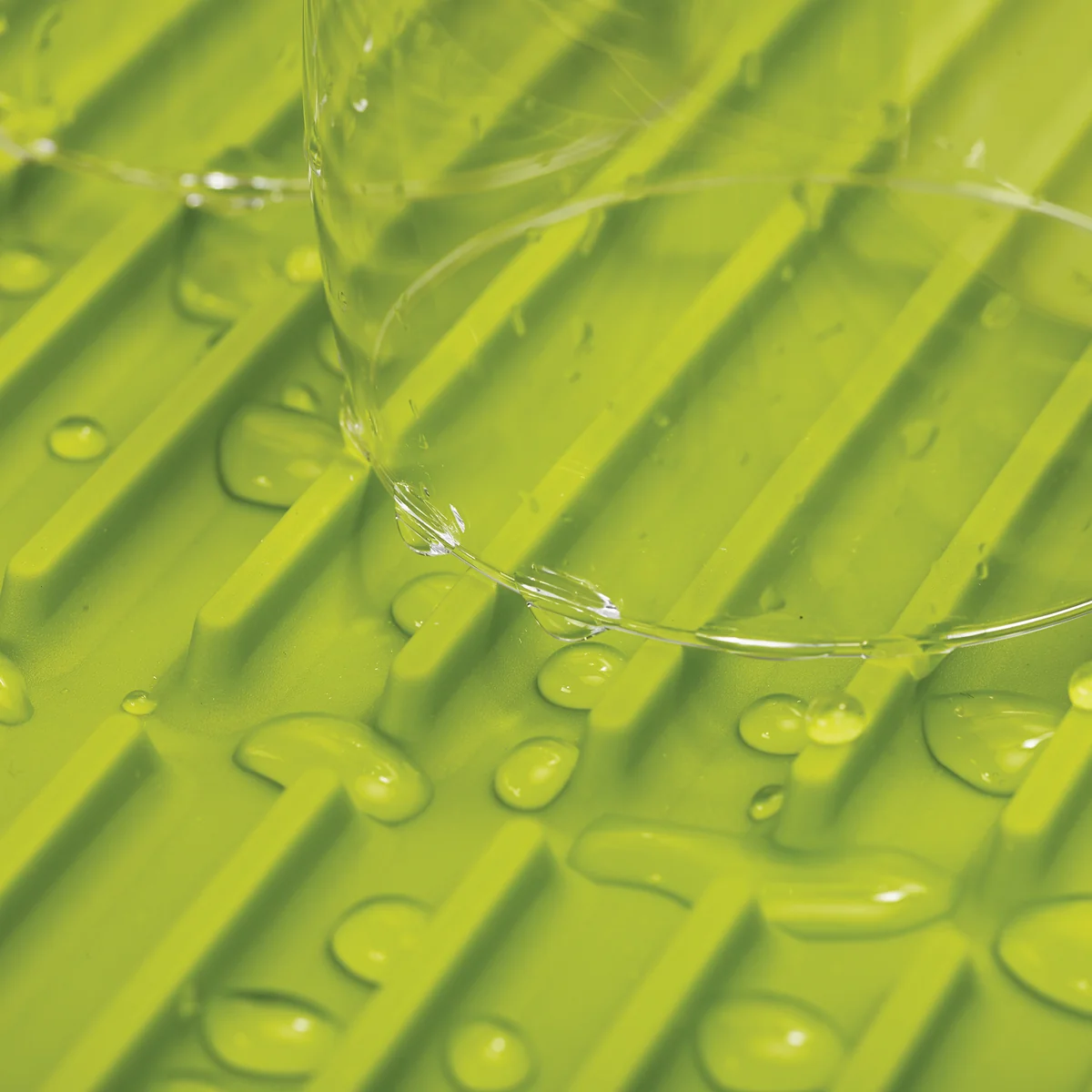 Dank der Fertigung aus weichem Gummi ist die Joseph Joseph Abtropfmatte auch für empfindliches Geschirr bestens geeignet. Nach dem Gebrauch kann die Flume Abtropfmatte einfach gereinigt werden und verschwindet anschliessend wieder platzsparend im Schrank.