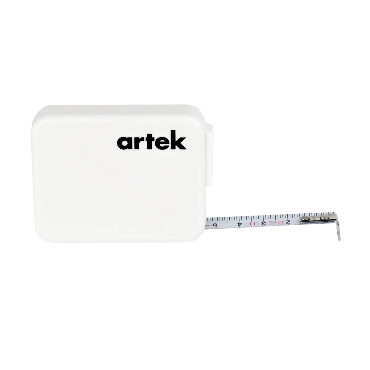 Das Massband von Artek kommt in einem schlichten, weissen Metallgehäuse mit prominentem Logo. Mit insgesamt 3 Metern Länge können mit dem Massband von Artek kleine und grössere Flächen vermessen werden.