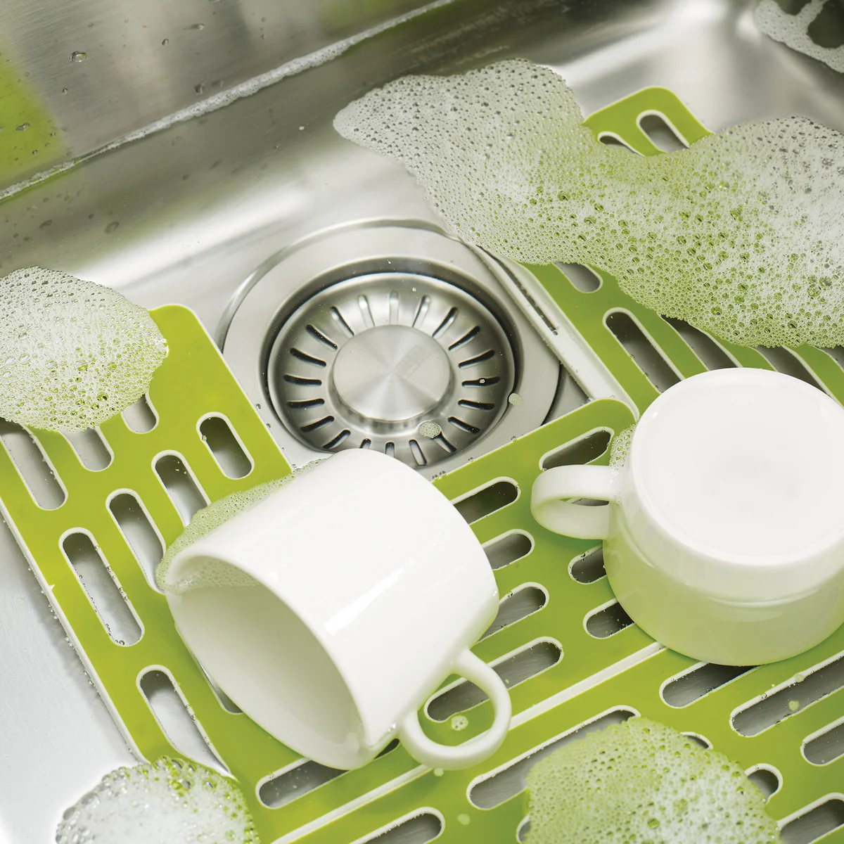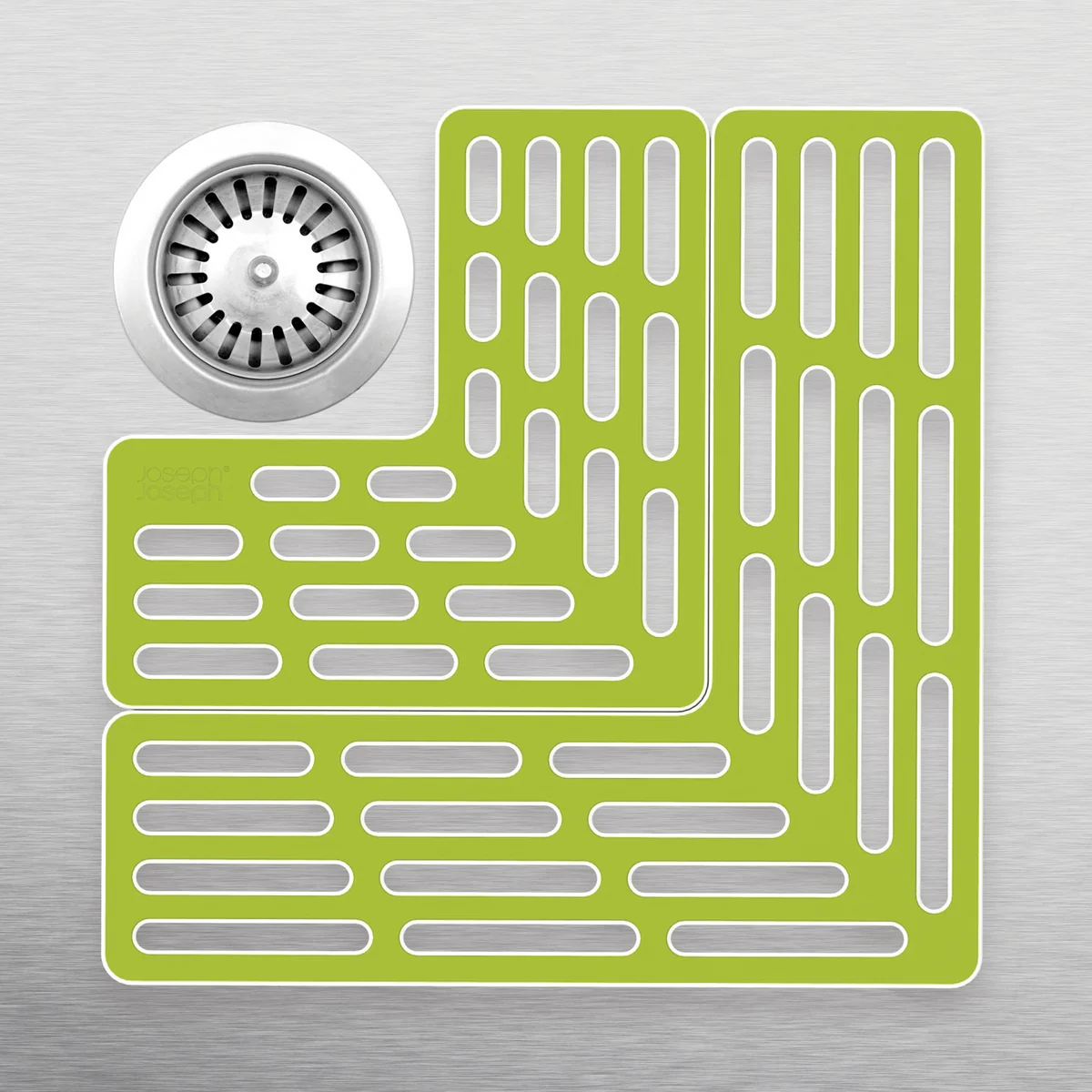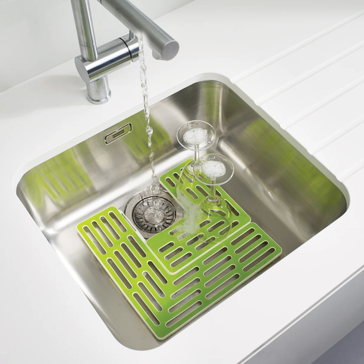 Händisches Abspülen oder Abstellen von hochwertigem Glas oder Porzellan in der Küchenspüle wird sicherer durch den Einsatz des SinkSaver Spülbeckenschutz. Durch seine Antirutsch-Füsse verrutscht die Matte von Joseph Joseph nicht und sorgt ausserdem dafür, dass das Wasser problemlos ablaufen und Luft darunter zirkulieren kann. Ausserdem werden empfindliche Edelstahl- oder Keramik-Spülbecken beim Abwasch geschützt.