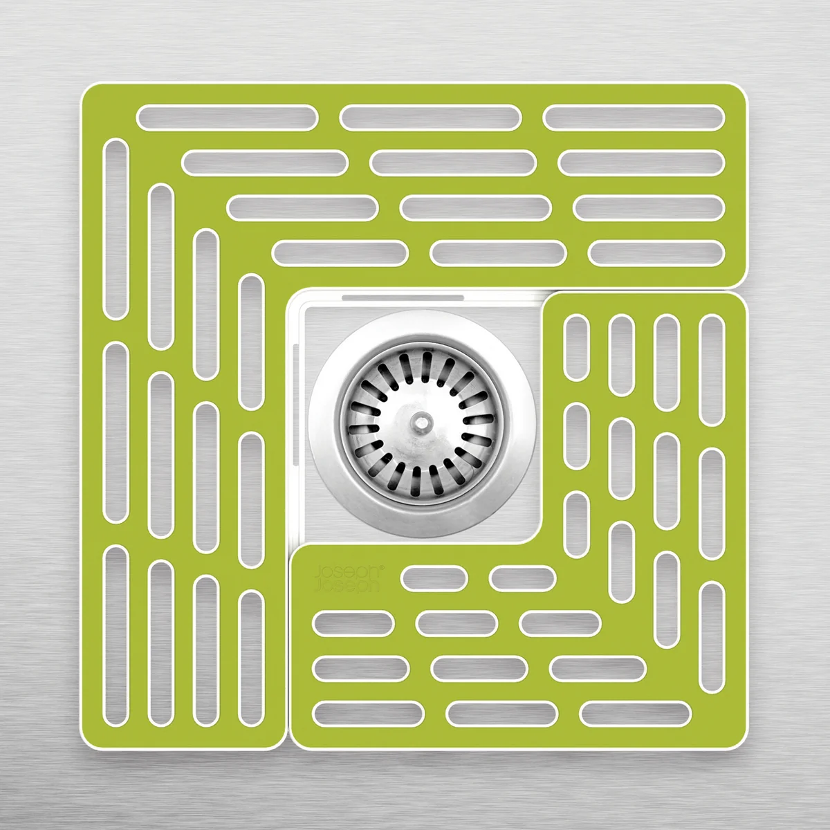 Der zweiteilige Einsatz lässt sich individuell um den Ablauf des Spülbeckens positionieren und ist dank seiner Antirutsch-Füsse ein zuverlässiger Schutz für empfindliches Geschirr. Die gitterartige Matte mit ihrer weichen Gummi-Oberfläche ist in verschiedenen Farben erhältlich.