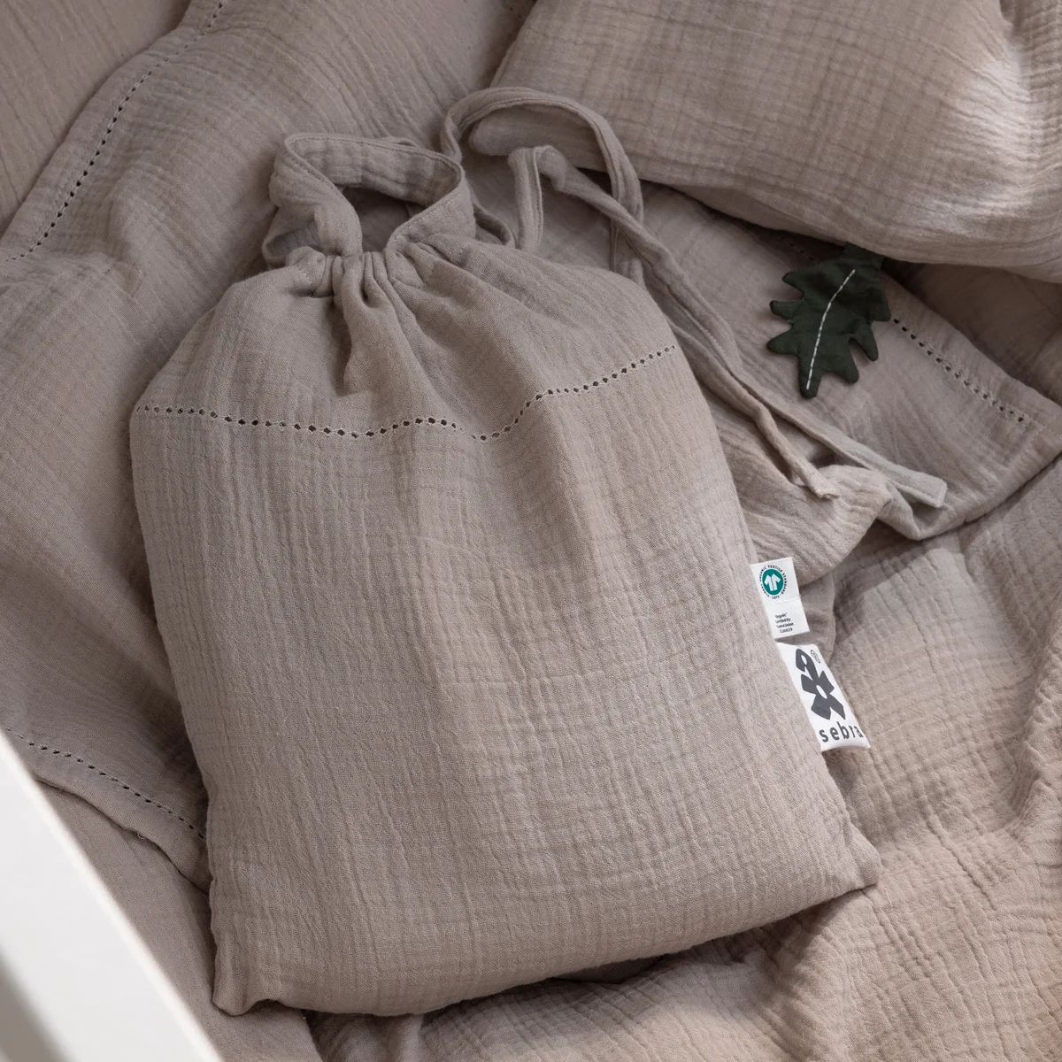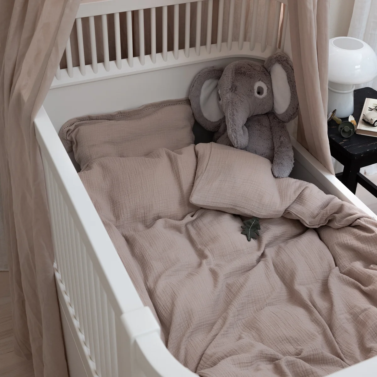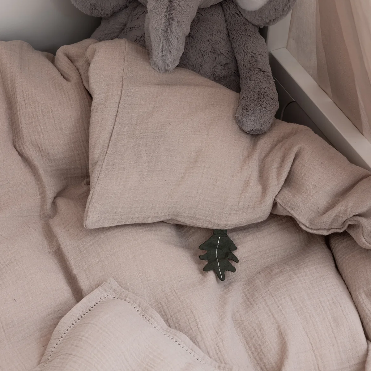 Das Set umfasst eine Bettdecke und ein Kissen in Junior-Grösse und ist perfekt für Betten in dieser Grössenordnung geeignet. Der zarte Musselin-Stoff schenkt den Kleinen ein behagliches und gemütliches Gefühl während des Schlafes, ohne die Atmungsaktivität einzuschränken.