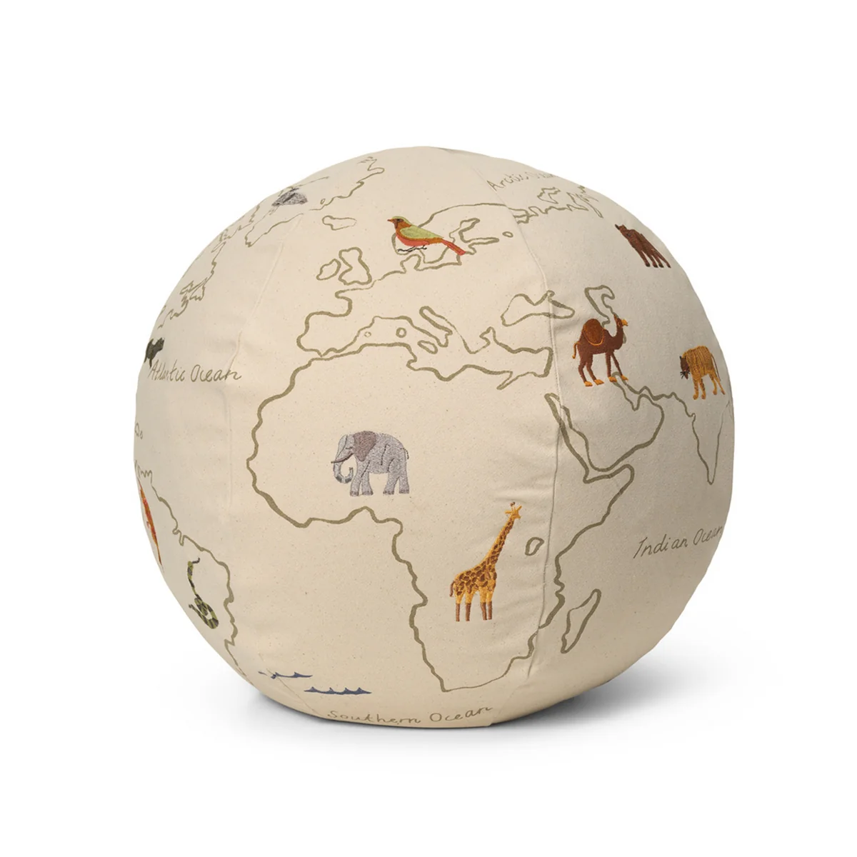 Der The World Pouf des Herstellers Ferm Living begeistert nicht nur mit seiner natürlichen Optik, sondern inspiriert zum Lernen über die Kontinente der Welt. The World ist eine spielerische Ergänzung für das Kinderzimmer. Die Umrisse der Kontinente sind mit niedlichen, bunten Tierfiguren verziert, welche auf den Stoff gestickt sind. Die Aussenhülle des Poufs wird aus 100% GOTS-zertifizierter Bio-Baumwolle gefertigt. Die Füllung besteht aus Vlies-Schmelzpapier mit Thermobällen. Bei Bedarf mit einem feuchten Tuch abwischen.