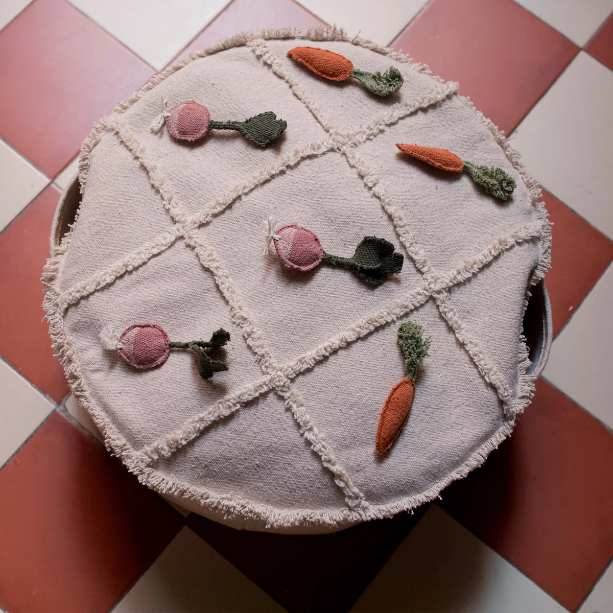 Der Tic-Tac-Toe Pouf des spanischen Herstellers Lorena Canals bieten Spiel und Spass für die gesamte Familie. Der Pouf ist Teil der Kollektion des Mutter-Tochter-Duos Oli&Carol. Die mini Stoff-Veggies dienen als Spielsteine und könne beliebig oft verwendet werden. Der Bezug des Poufs wird aus Baumwolle gefertigt, befüllt wird er mit Polystyrol-Perlen.