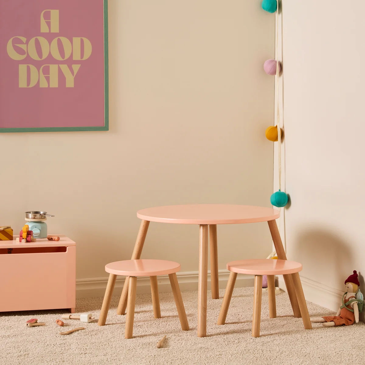 Die passenden Hocker bieten nicht nur bequeme Sitzgelegenheiten, sondern auch zusätzlichen Stauraum unter dem Sitz - ideal für Spielzeug, Bücher oder Kunstmaterialien. So bleibt das Kinderzimmer ordentlich und aufgeräumt, während die Kinder sich in ihrer eigenen kleinen Welt verlieren.