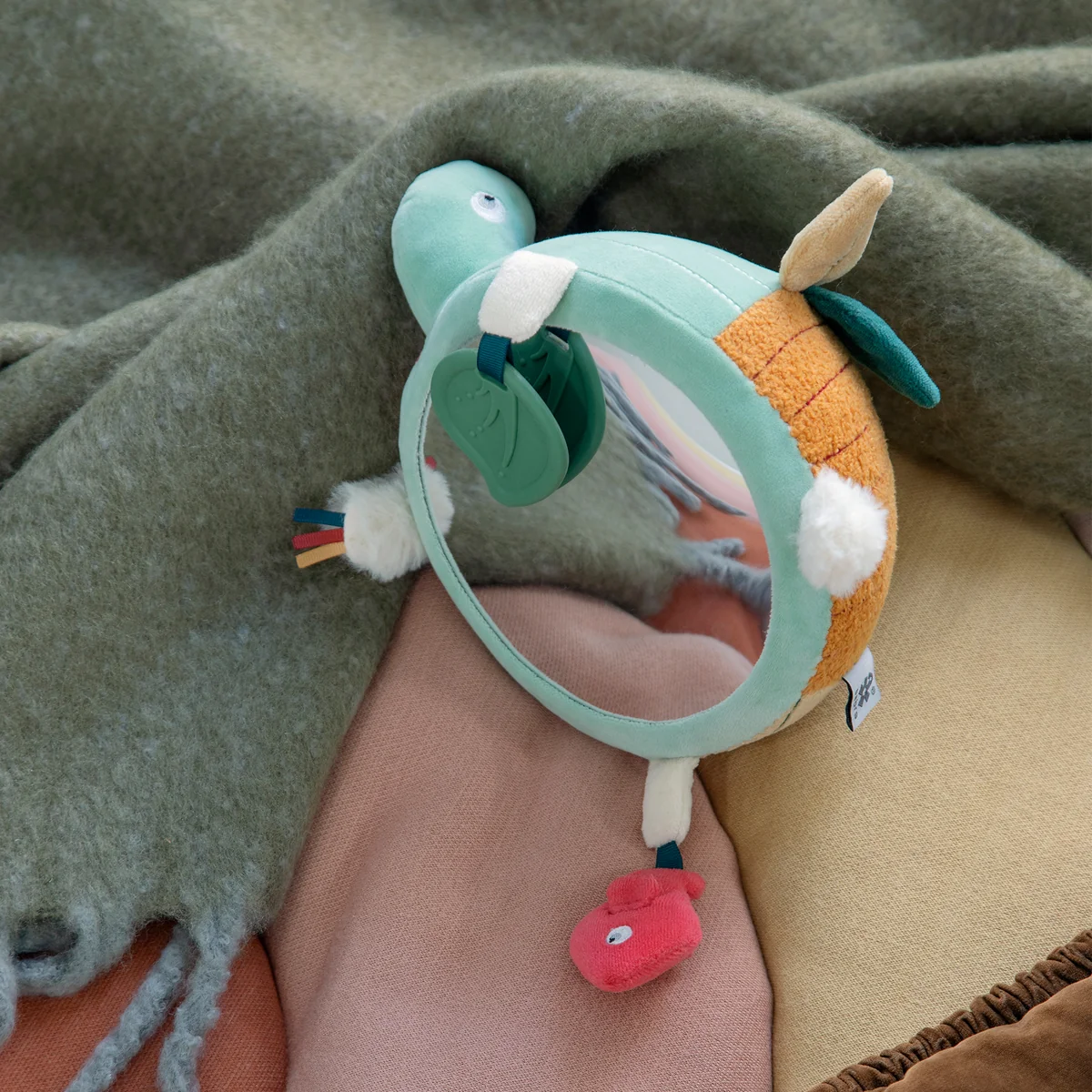 Die Schildkröte ist mit Memory-Foam befüllt, welcher weich ist und so seine Form behält, wenn die Kleinen damit spielen. Den Bauch ziert ein bruchsicherer Babyspiegel, wodurch die kleinsten Familienmitglieder Bewegungen und Gesichtsausdrucke beobachten können.