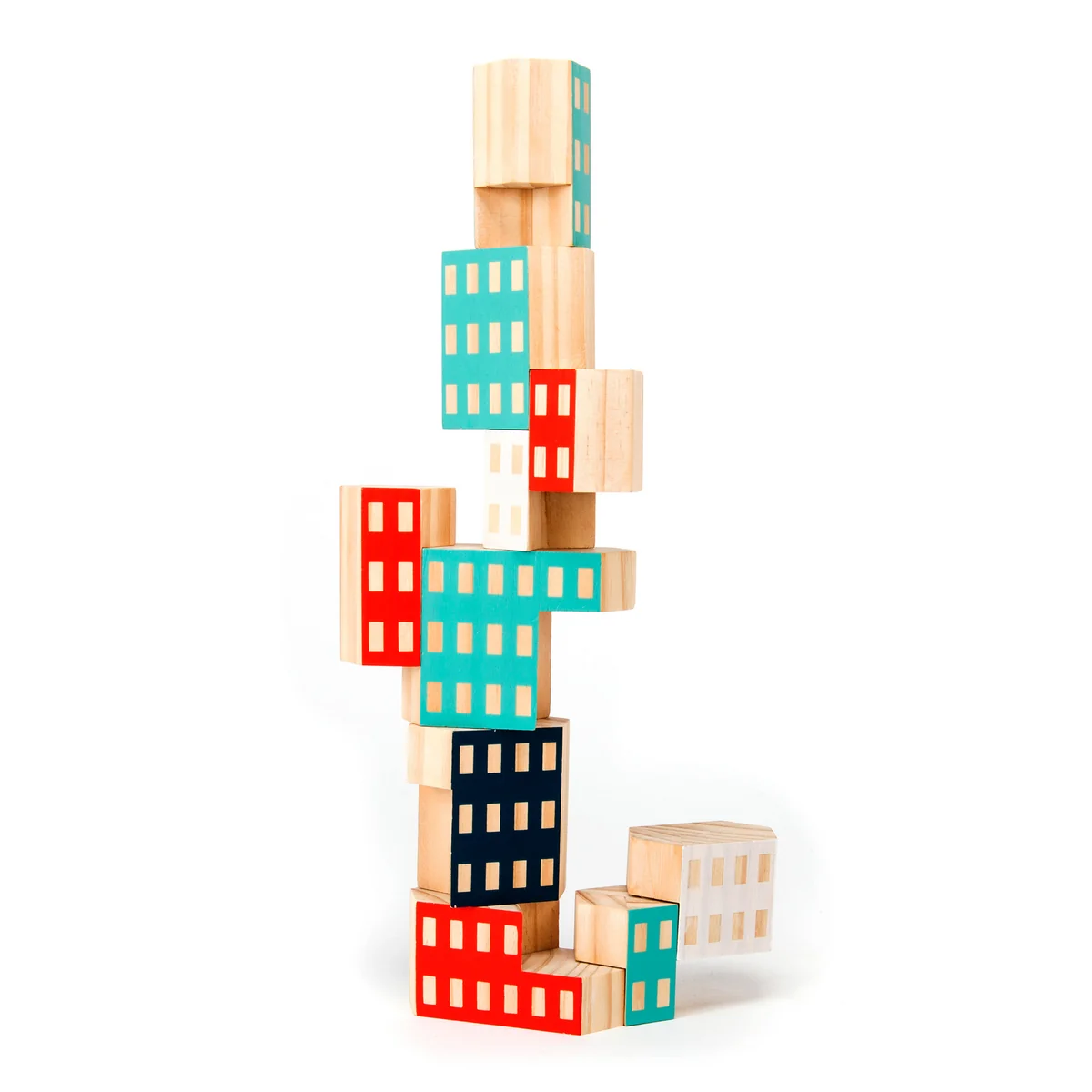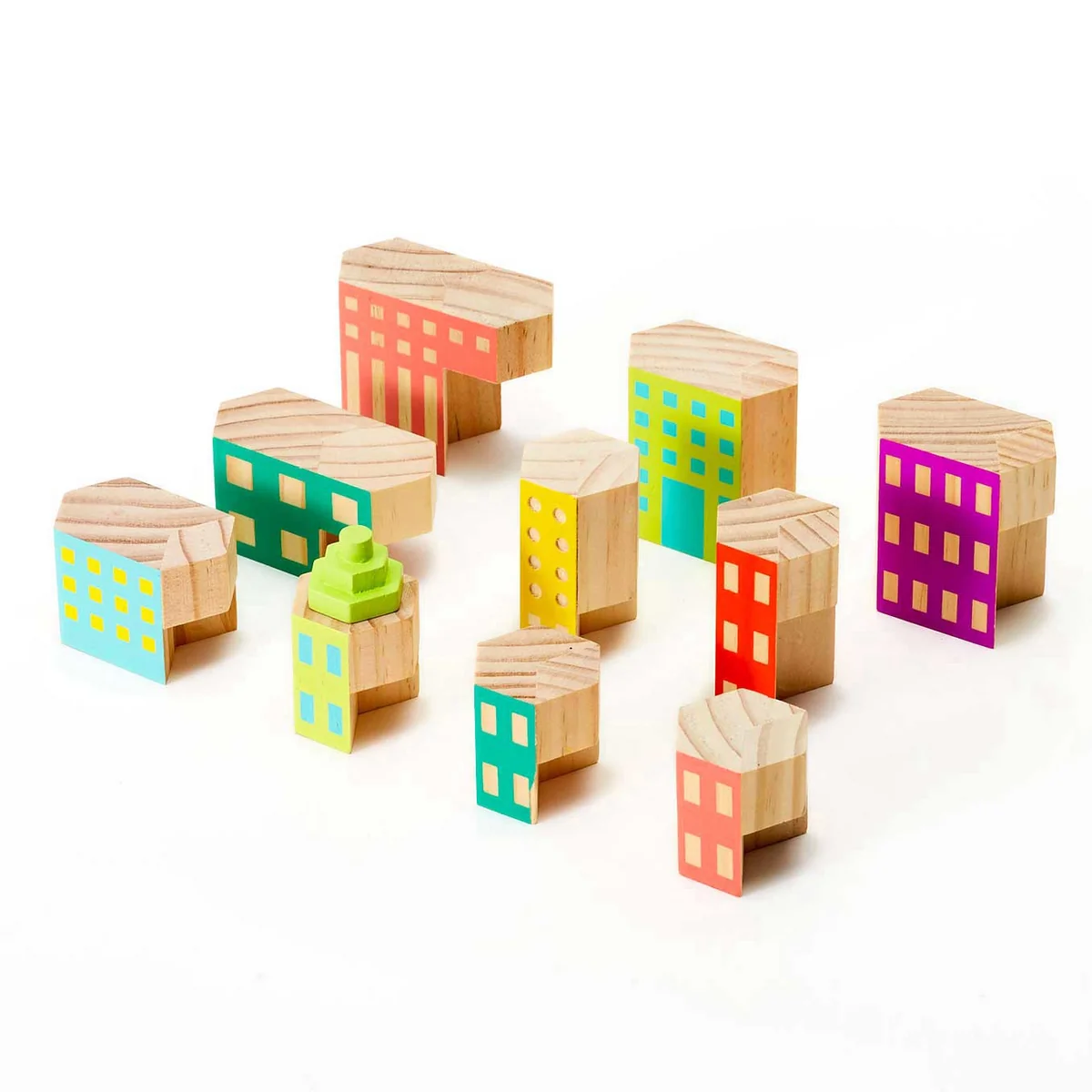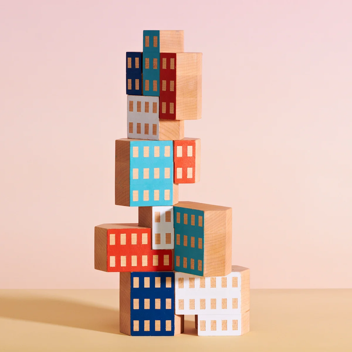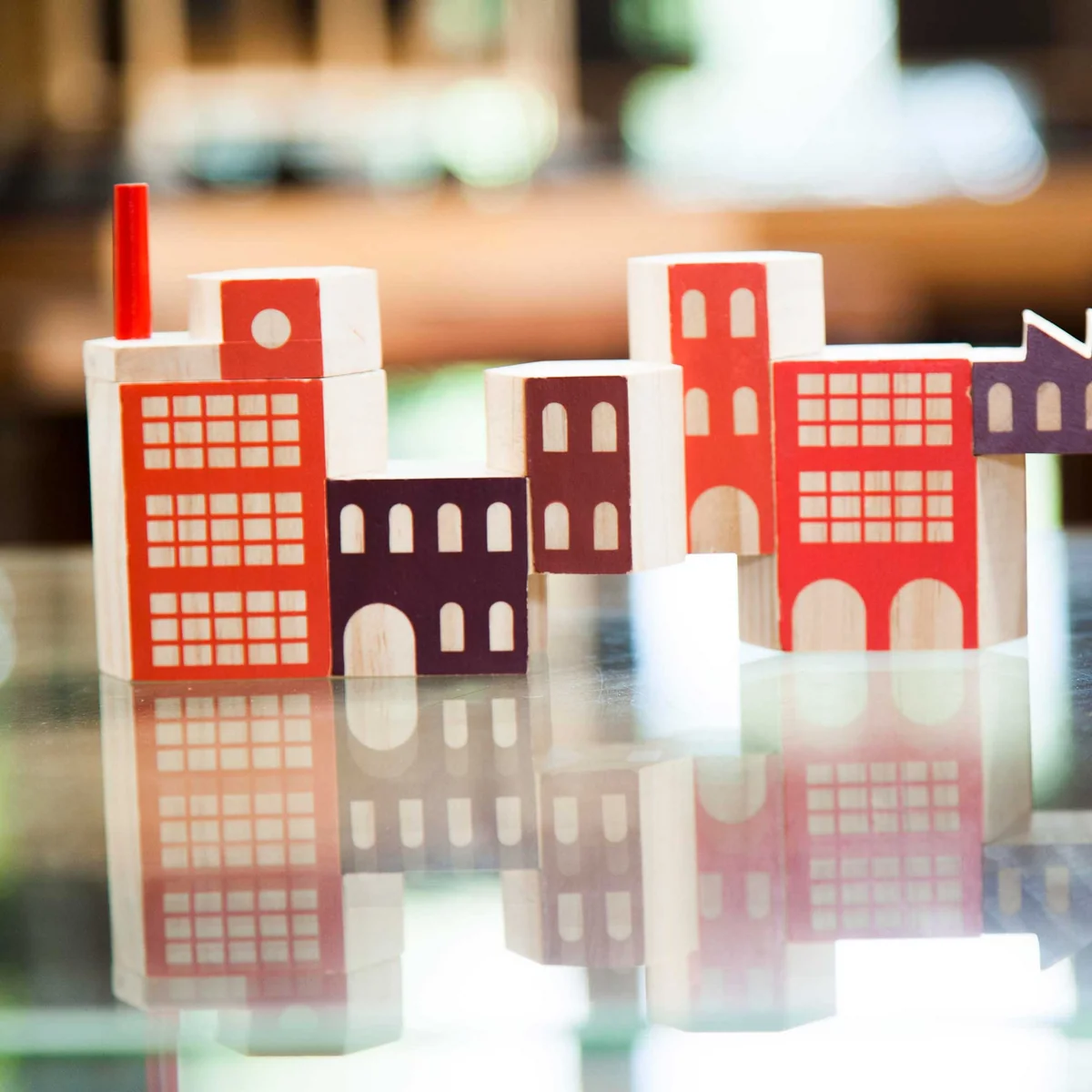 Die Blöcke aus hochwertigem neuseeländischen Pinienholz sind sorgfältig so bemalt, dass der Anschein erweckt wird, es handle sich um kleine Häuserfronten mit Fenstern darin. Auch Parklandschaften, moderne Wohnkomplexe und Fabriken lassen sich mit Blockitecture nachbauen. Für noch grössere Baukomplexe lässt sich das Blockitecture-Set von Designer James Paulius beliebig erweitern und untereinander kombinieren.