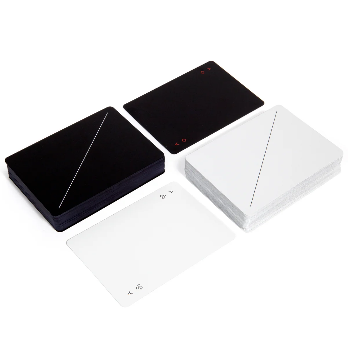 Die Minim Spielkarten aus dem Hause Areaware begeistern mit ihrem modernen, minimalistischen Design bei gleichbleibender, altbekannter Freude beim Spielen. Die simplen geometrischen Symbole von Herz, Karo, Kreuz und Pik sind auf das Nötigste reduziert. Gleiches gilt für die Rückseiten, welche mit einer schlichten, diagonalen Linie verziert sind. Die Karten werden aus einem Papier-PVC Materialmix gefertigt.