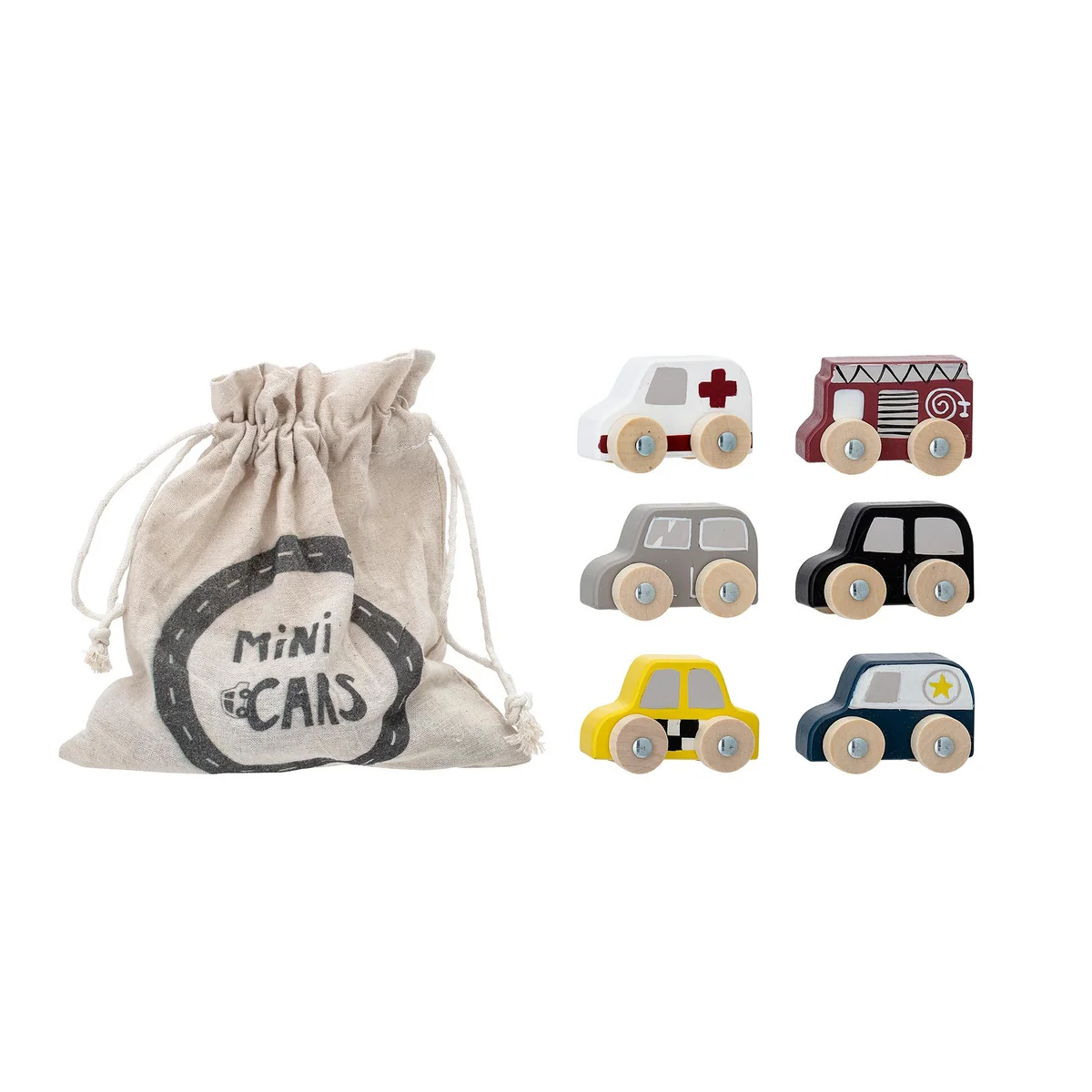 Mit den Holzfahrzeugen von Bloomingville lassen sich Abenteuer im Kinderzimmer erleben. Das Set besteht aus sechs verschiedenen Fahrzeugen mit Rollen inklusive Taxi, Polizeiauto, Krankenwagen und Feuerwehrauto. Mit den Fahrzeugen haben gross und klein besonders viel Freude auf einem Spielteppich mit Strassen.