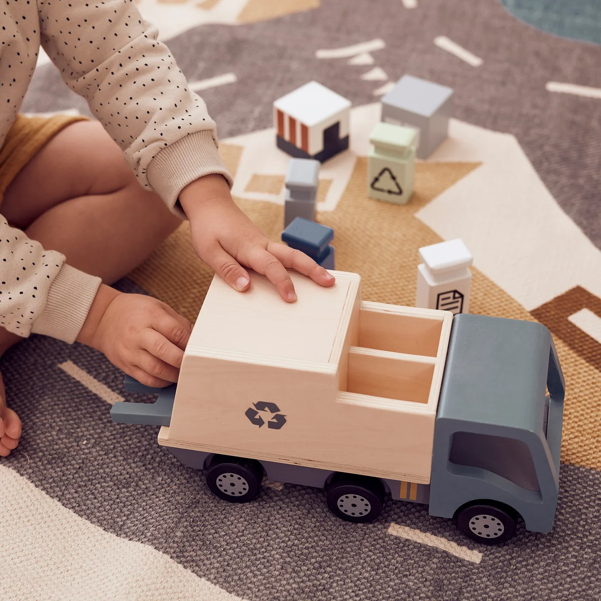 Der Aiden Müllwagen von Kids Concept ist ein hölzerner Müllwagen mit vier Sortierbehältern, der einsatzbereit zum Recyceln ist. Diese Behälter können auf dem hinteren Lift positioniert und in den Wagen gehoben werden. Jeder Behälter ist mit unterschiedlichen Symbolen für Papier, Glas und Metall versehen, was eine effiziente Sortierung erleichtert.
