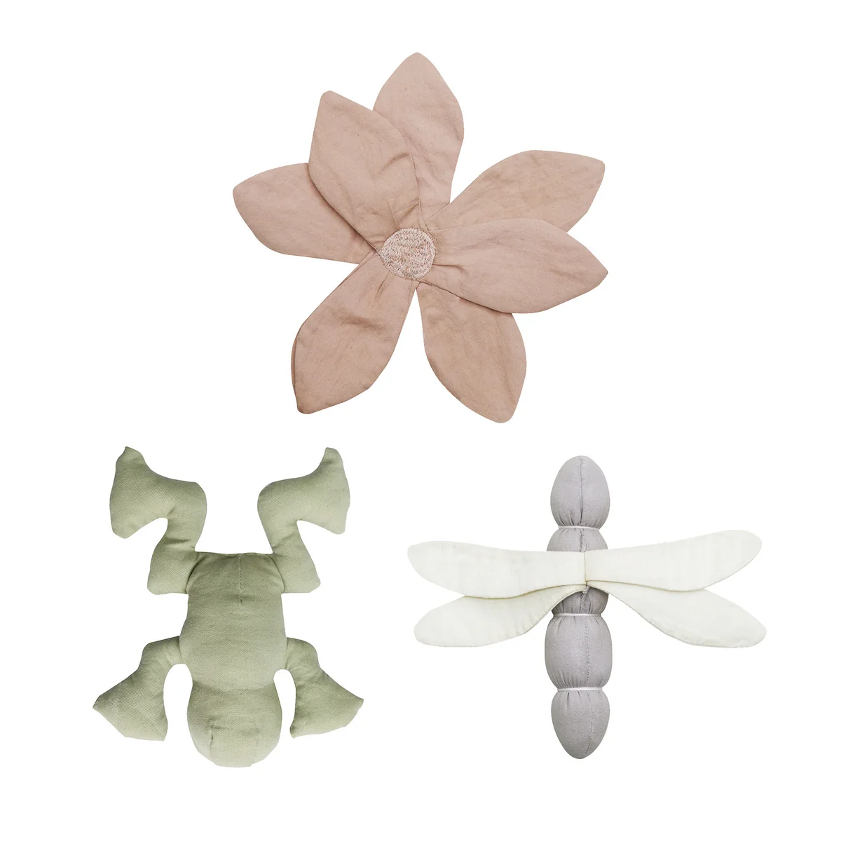 Das Baby Aktivitätsspielzeug des Herstellers Lorena Canals schult alle Sinne der kleinsten Familienmitglieder! Das Knistern und Rasseln der Spielzeuge sorgt für äusserst lustige Spielmomente. Das 3er-Set besteht aus einer Seerose, einem Frosch und einer Libelle. Die Spielelemente können bei Bedarf wunderbar simpel in der Waschmaschine gereinigt werden. Die Bezüge werden aus Bio-Baumwolle gefertigt, die Füllung besteht aus recyceltem Polyester, sowie Kringelpapier und Rasseln.