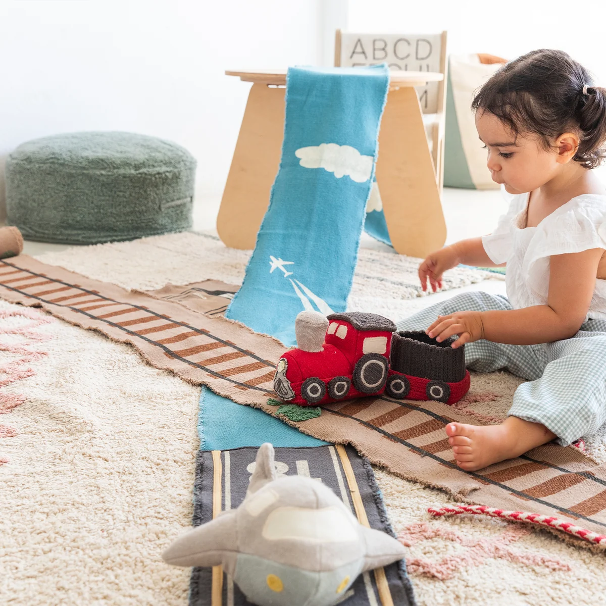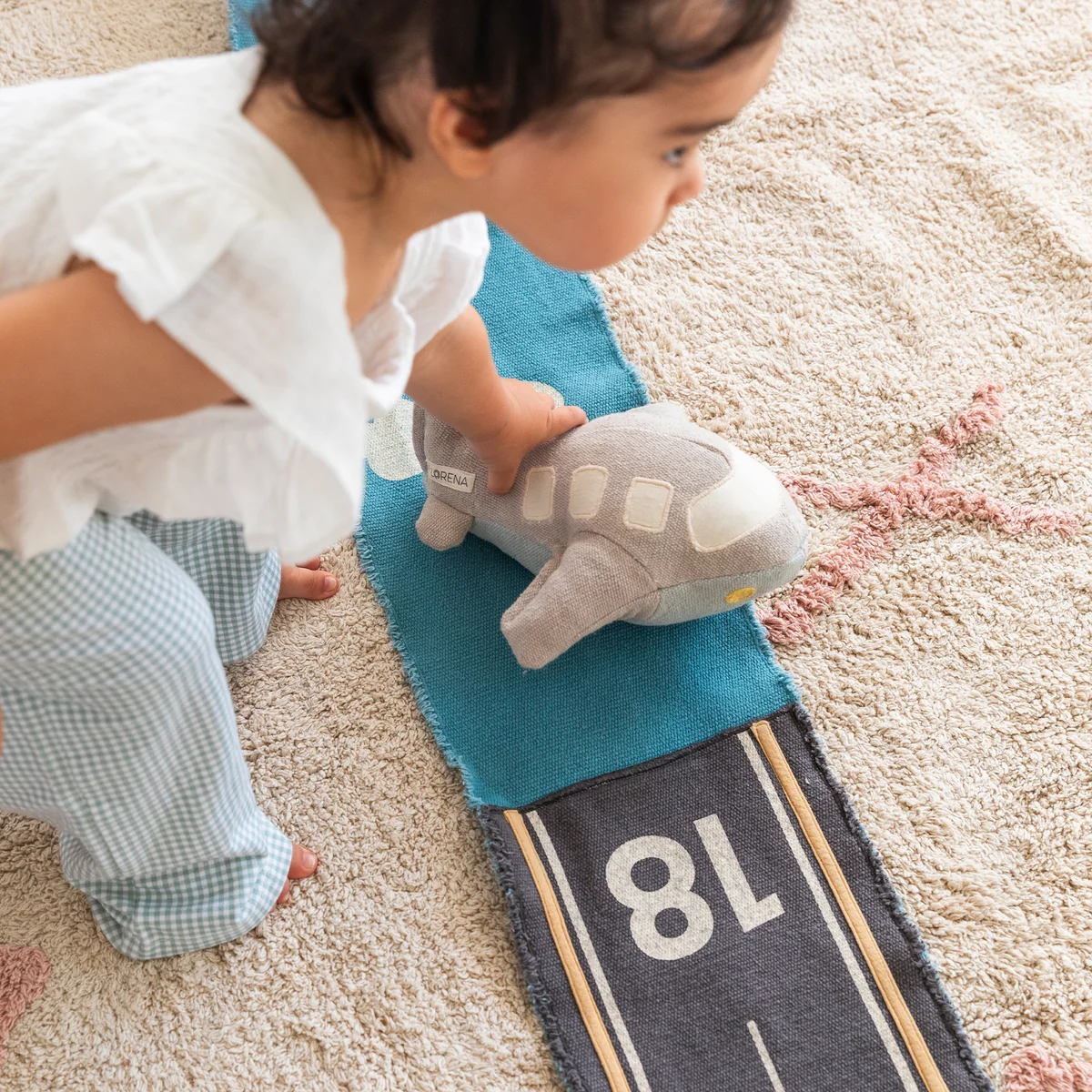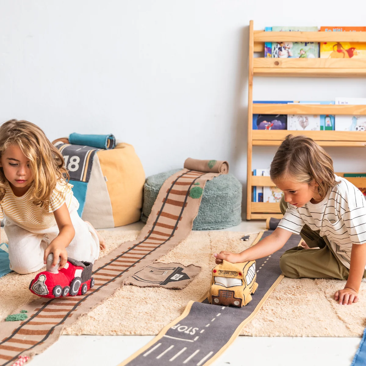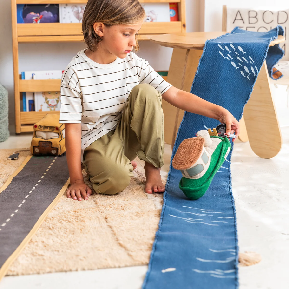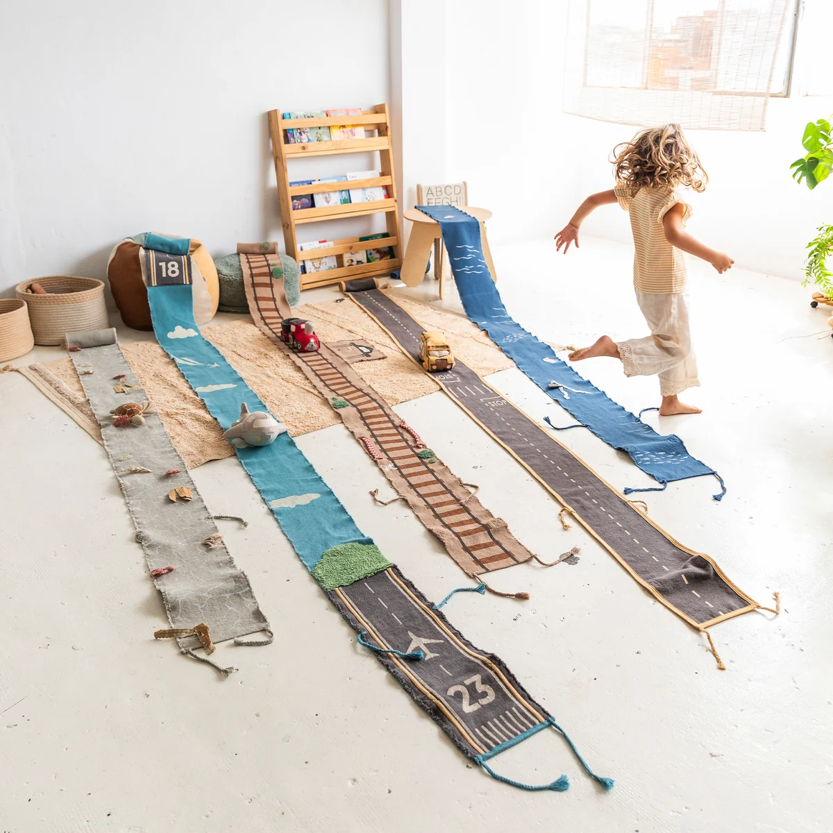 Das Ride & Roll Spielset des Herstellers Lorena Canals bietet eine Menge Fahrspass! Das Set ermöglicht, dass Kinder den langen Planenweg überall ausrollen und mit dem Stoffbus diesen befahren können. Die Baumwollplane ist vier Meter lang und wird aus Baumwolle und Polyester gefertigt.