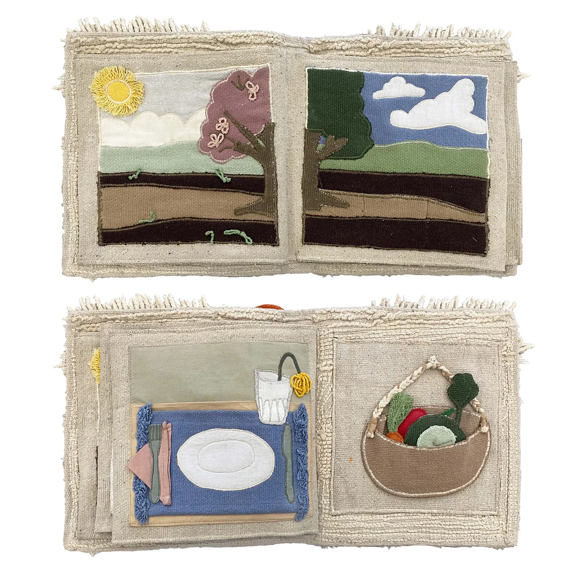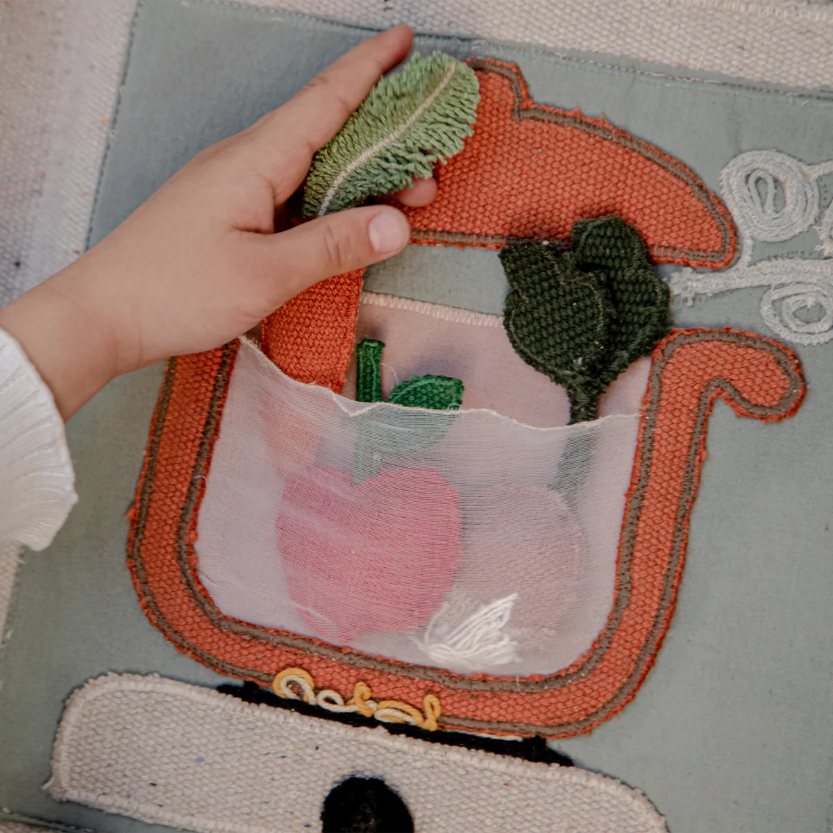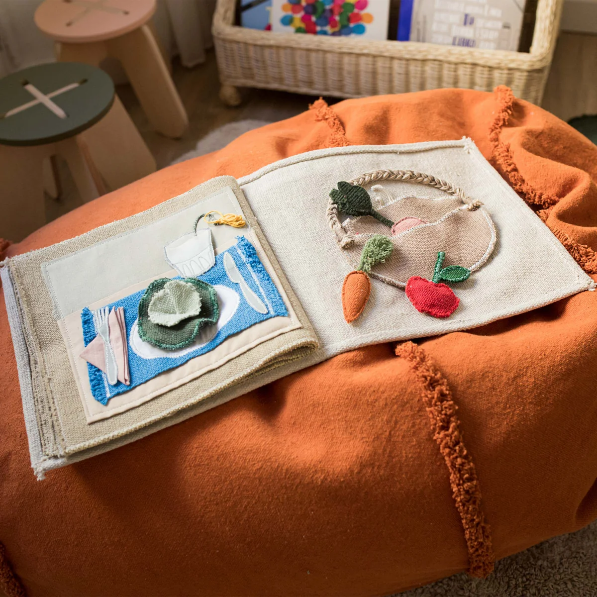 Stoffbuch mit einsetzbaren Gemüse- und Obstelementen