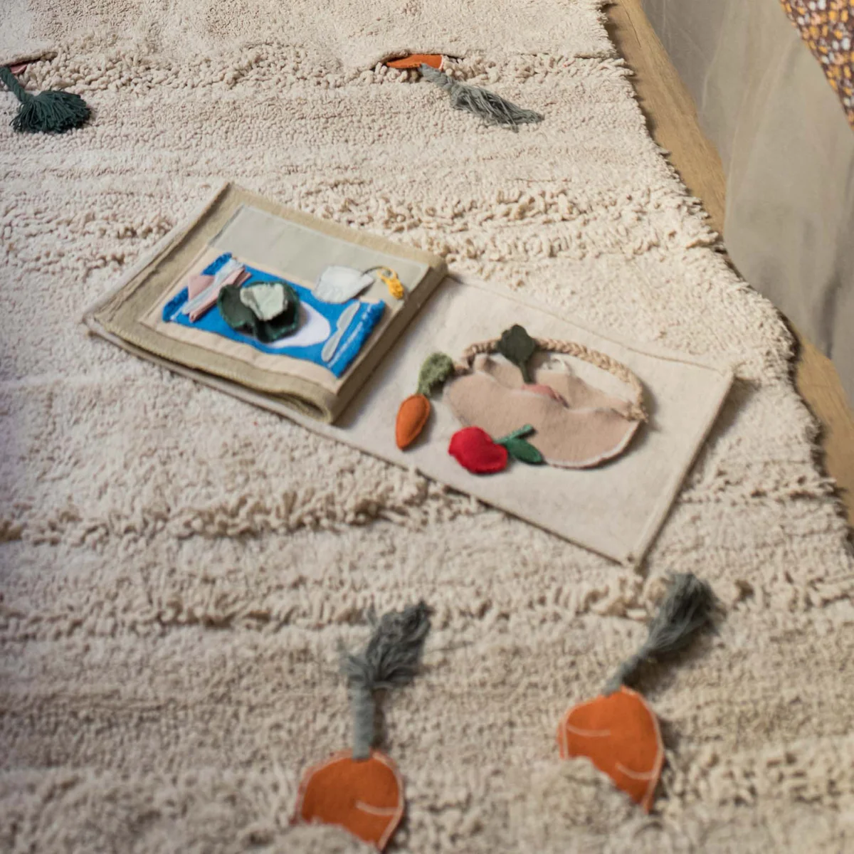 Das Stoffbuch Cool kids eat healthy von Oli&Carol aus dem Hause Lorena Canals lehrt auf spielerische Weise einen gesunden Umgang mit Lebensmitteln. Die kleinen Obst- und Gemüseelemente können ganz nach Belieben im Buch eingesetzt werden - Ob auf dem Teller oder im Korb. So kann es wunderbar als Beschäftigungsmöglichkeit beim Warten aufs Abendessen genutzt werden.