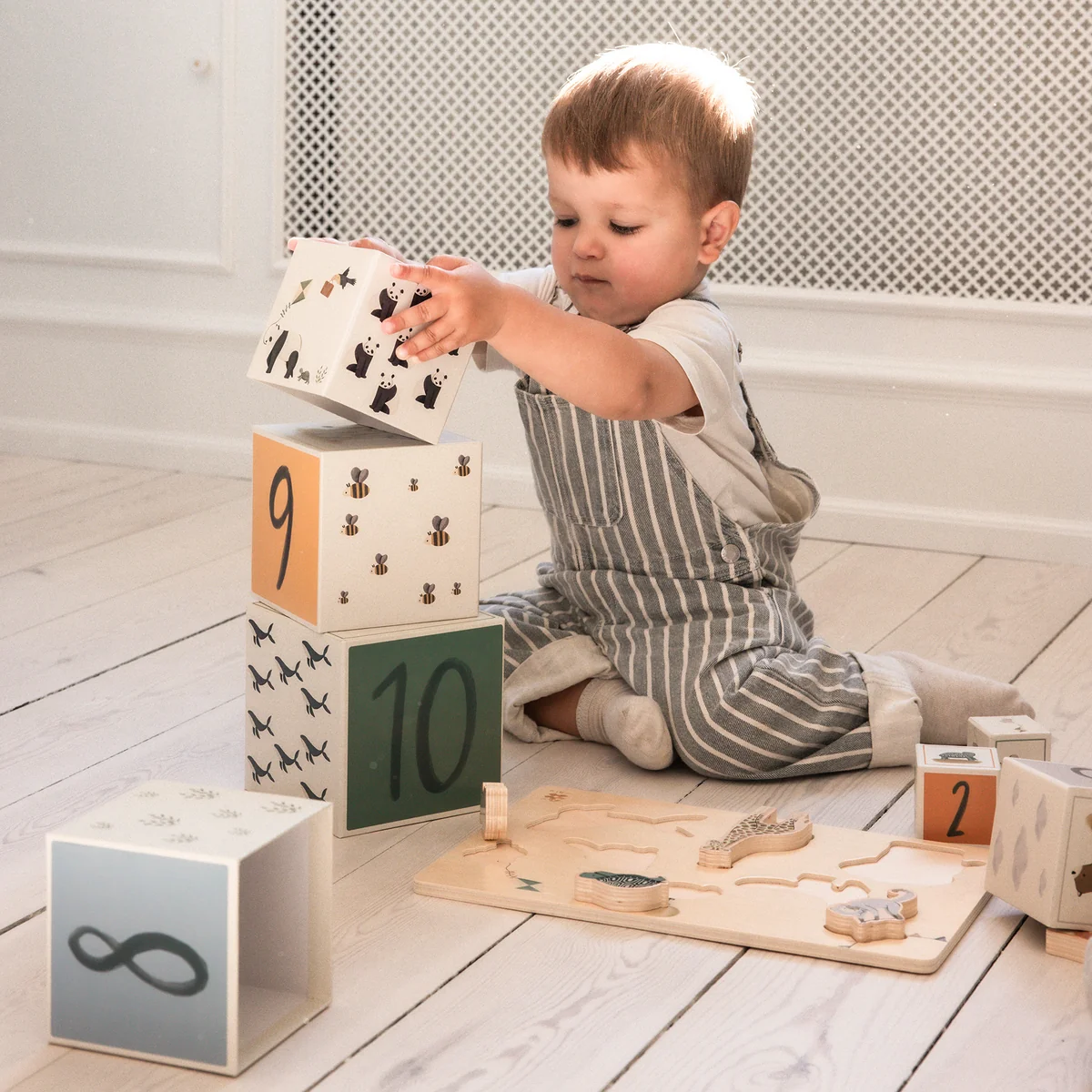 Auf den Blöcken aus festem Karton sind die Zahlen 1 bis 10 abgebildet. Damit lernen Kinder auf spielerische Weise die Zahlen kennen und bekommen ein Gefühl für „kleiner“ und „grösser“, denn der grösste Block hat die Zahl 10 und der kleinste die Zahl 1.