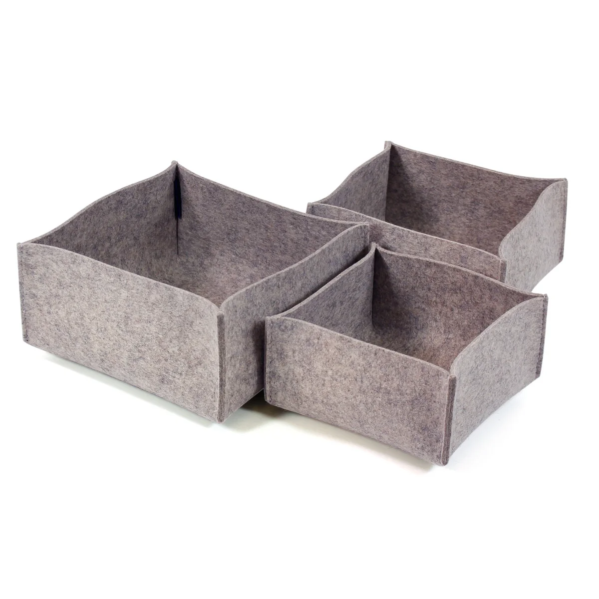 Das Box Set 2 von Hey Sign besteht aus drei unterschiedlich grossen Filzboxen, die sich einfach einander stapeln lassen. Stoffboxen zur Aufbewahrung von Accessoires oder als praktischer Korb für Brot und Brötchen am Frühstückstisch.
