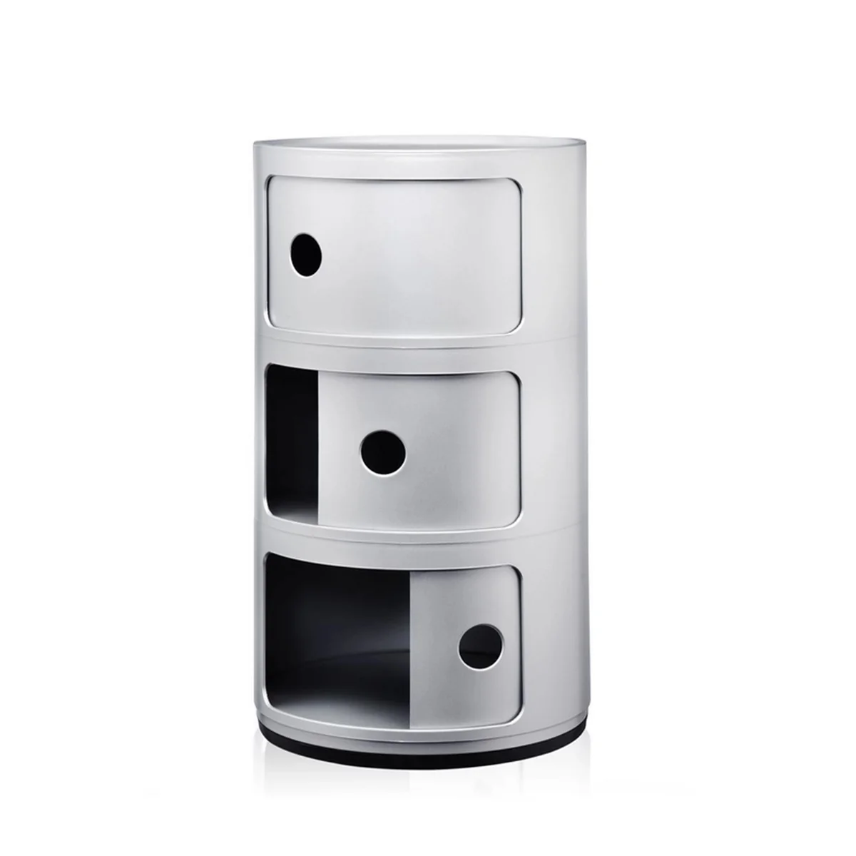 Die Componibili gibt es rund und quadratisch und sie können auch auf Rollen geliefert werden. Flexibel, funktional, praktisch: Die Componibili sind ein Designklassiker mit dreissigjähriger Tradition, der wegen der Prägnanz und Innovation der Gestaltung viel Anerkennung erlangt hat und längst in die ständige Ausstellung des Museums of Modern Art in New York und ins Centre George Pompidou in Paris gerollt ist.