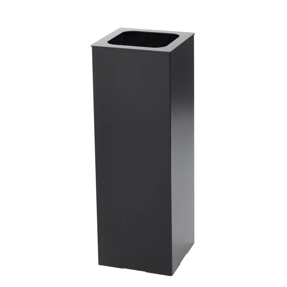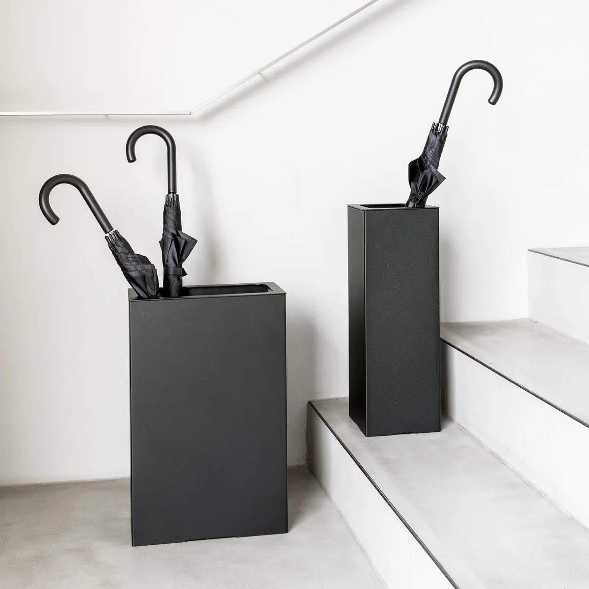 Der Schirmständer wird aus nahtlos verschweisstem Stahlblech mit einer schwarzen Pulverbeschichtung hergestellt. Den Ständer gibt es sowohl in einer quadratischen als auch in einer schmalen rechteckigen Version. So ist für jede Raumsituation und für jeden Geschmack das Richtige dabei.