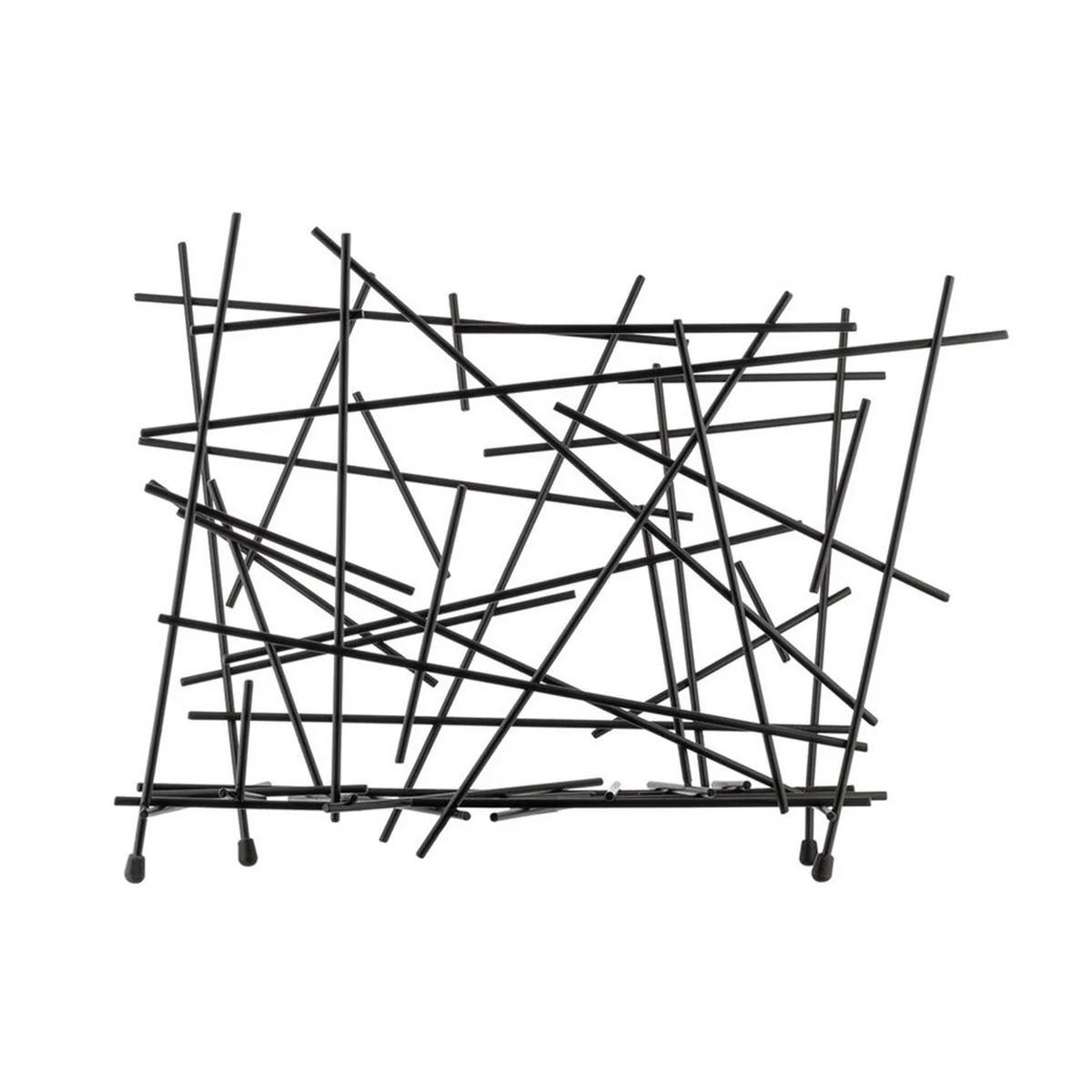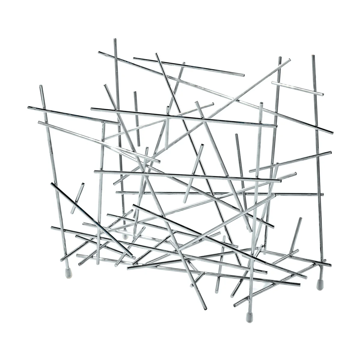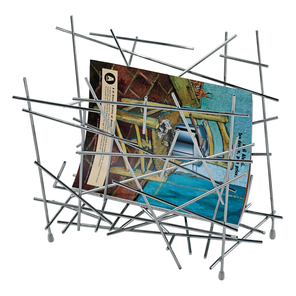 Dem an Mikado erinnernden Alessi Blow Up Zeitschriftenhalter liegt die Idee zugrunde, hypothetische Stahldrahtreste miteinander zu verschweissen, um verschiedene Behälterformen zu kreieren.