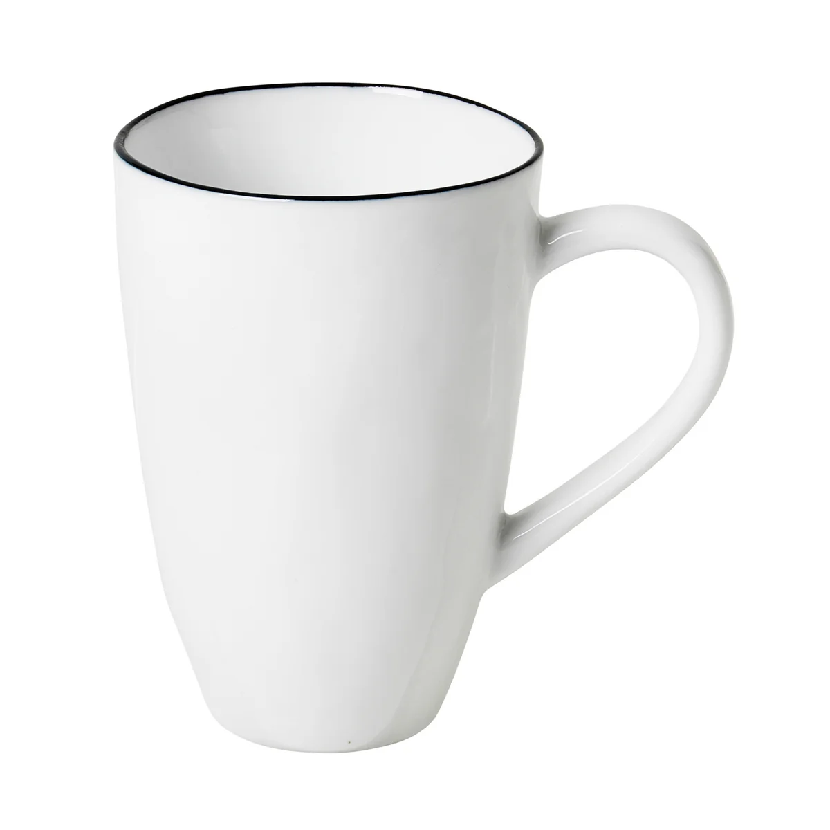 Aus dem Salt Becher mit Henkel von Broste Copenhagen lässt sich der Kaffee am Morgen oder der Tee am Nachmittag wunderbar geniessen. Die Tasse stammt aus der Salt Geschirr-Kollektion und zeichnet sich durch klassische Formen mit Eleganz und Schärfe aus. Die weisse Glasur wird durch handbemalte schwarze Ränder ergänzt. Die Glasur erhält im Brennprozess ihre unverwechselbare Textur und Farbe, die jedes Geschirrstück einzigartig macht.