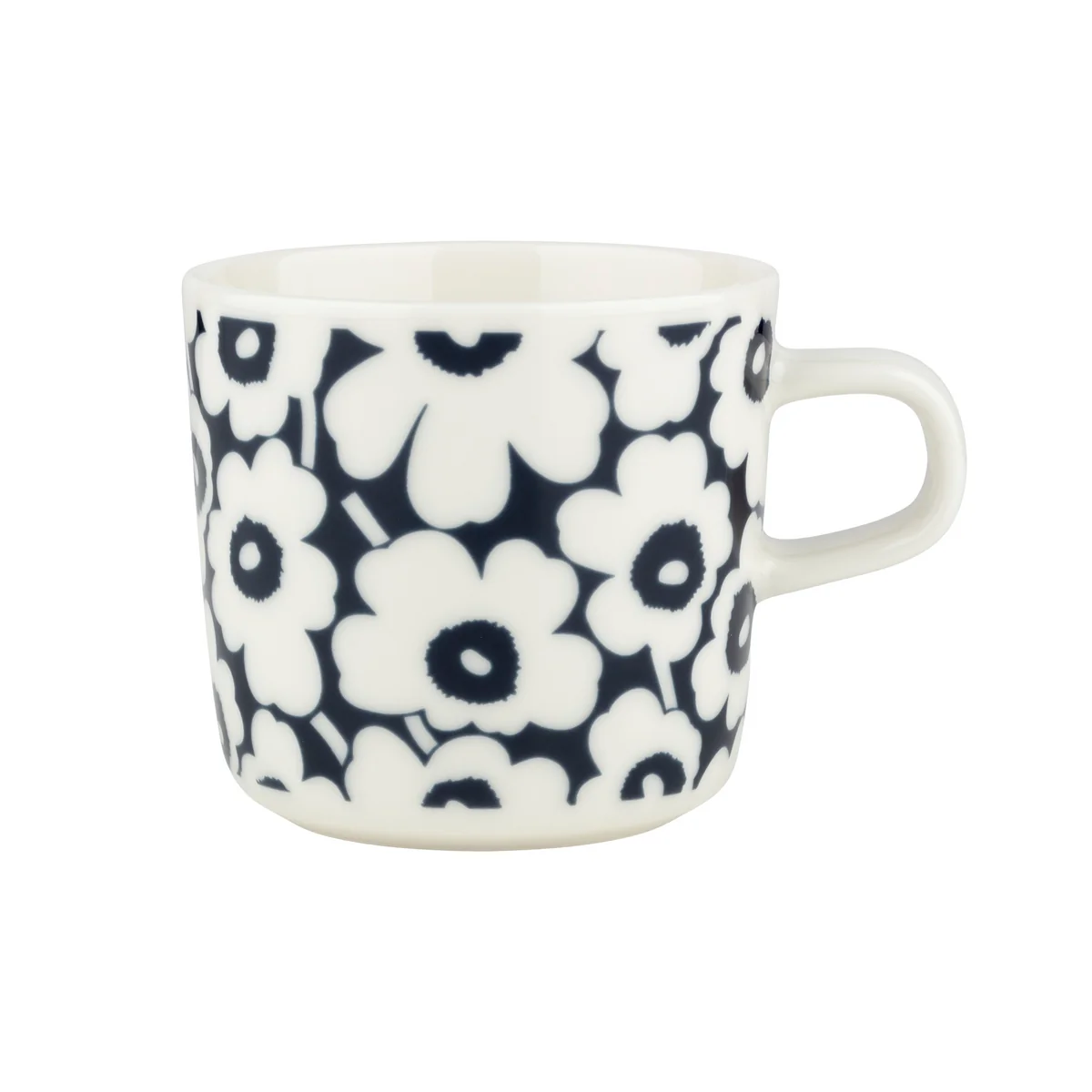 Der Oiva Pikkuinen Unikko Becher mit Henkel aus dem Hause Marimekko ist aus weissem Steingut gefertigt und zeigt das Pikkuinen Unikko-Muster. Sie ist spülmaschinen-, ofen-, mikrowellen- und gefrierfest.