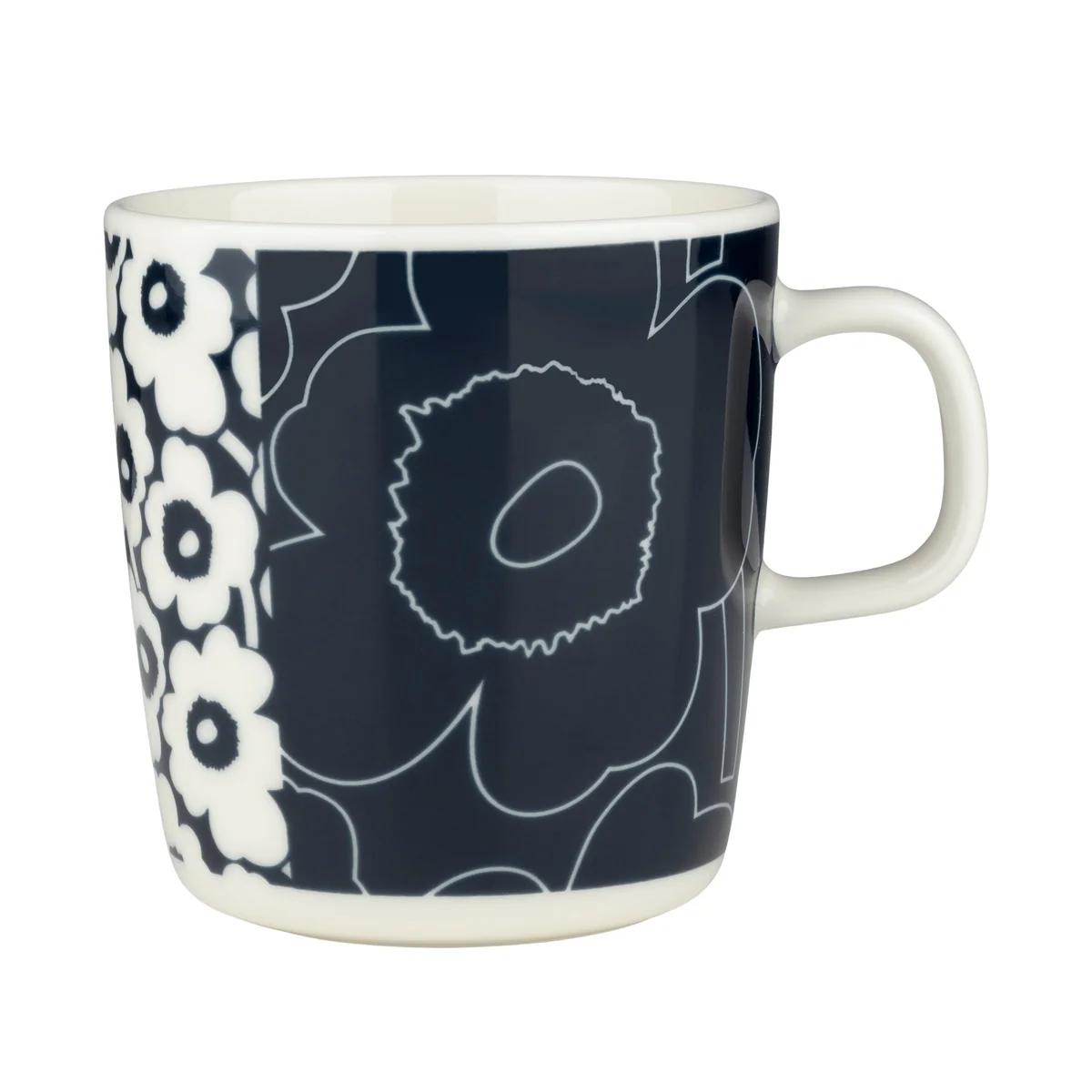 Der Oiva Unikko Kollaasi Becher mit Henkel von Marimekko wird aus weissem Steingut hergestellt und ist daher spülmaschinen-, backofen-, mikrowellen- und gefrierschrankgeeignet.