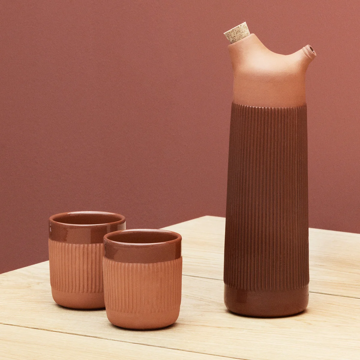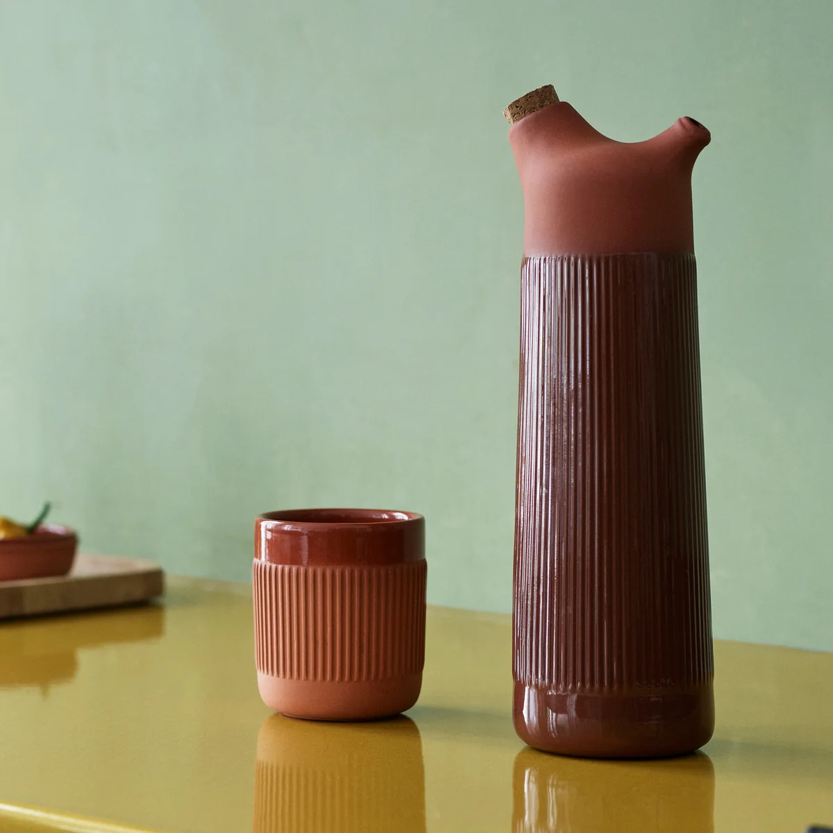 Entworfen von Simon Legald ist die Formgebung des Bechers straff und dabei doch sanft, mit einer freundlichen, handgearbeiteten Optik, die von der rustikal gebrannten Terrakotta hervorgehoben wird. Diese Farbtöne bringen einen Hauch von mediterraner Wärme auf den Esstisch.