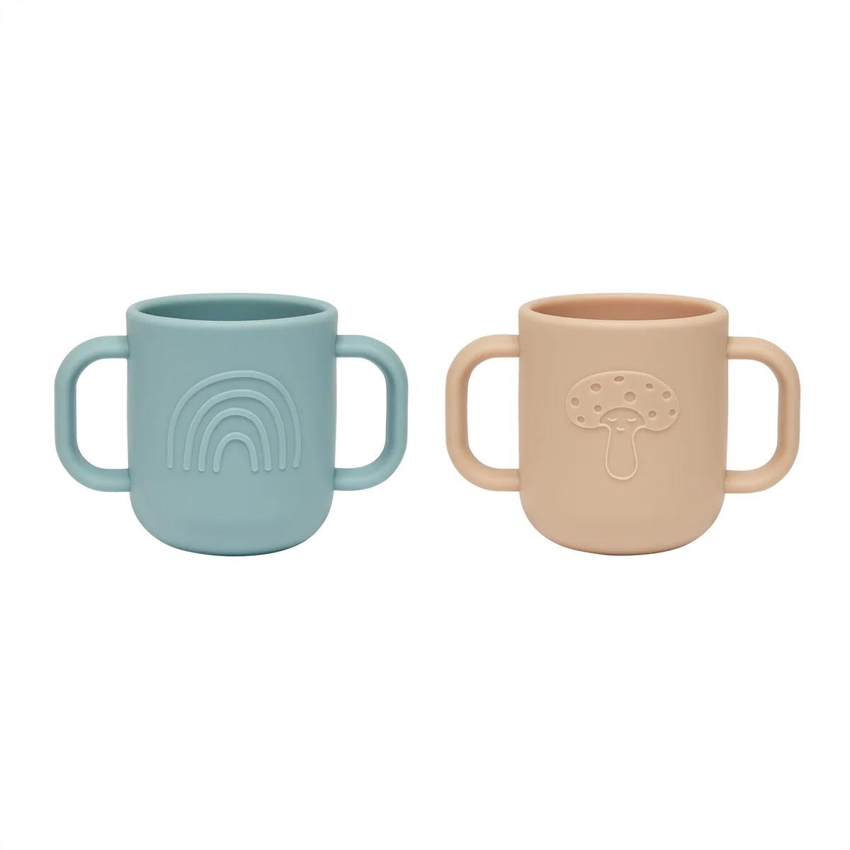 Die Kappu Kinderbecher mit Henkel von OYOY Mini sind vollständig aus Silikon gefertigt und mit bekannten OYOY Figuren wie Pilzen und Regenbogen verziert. Die Becher sind in pastelligen Farben gestaltet und verfügen über zwei Griffe, die es dem Kind erleichtern, selbständig zu trinken.