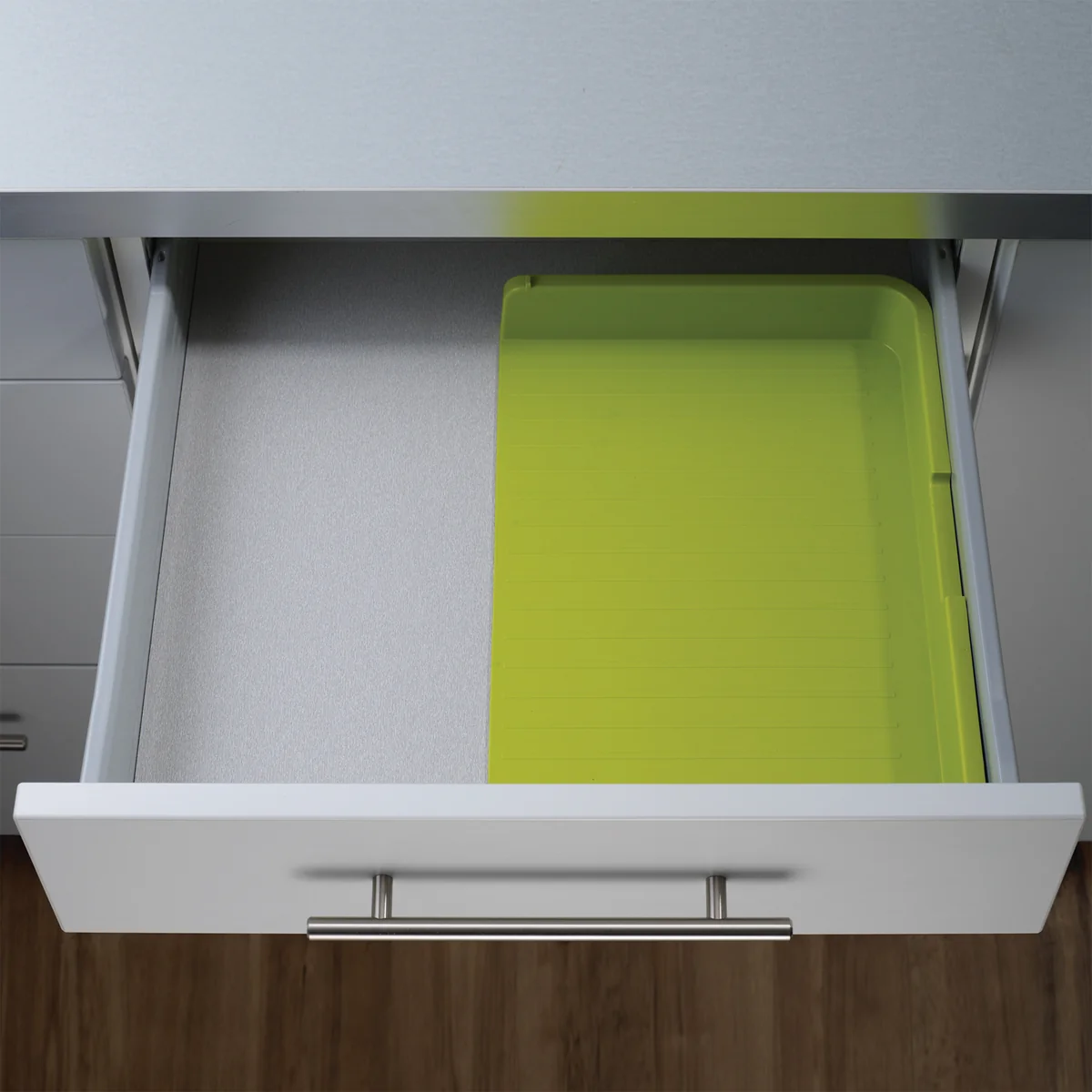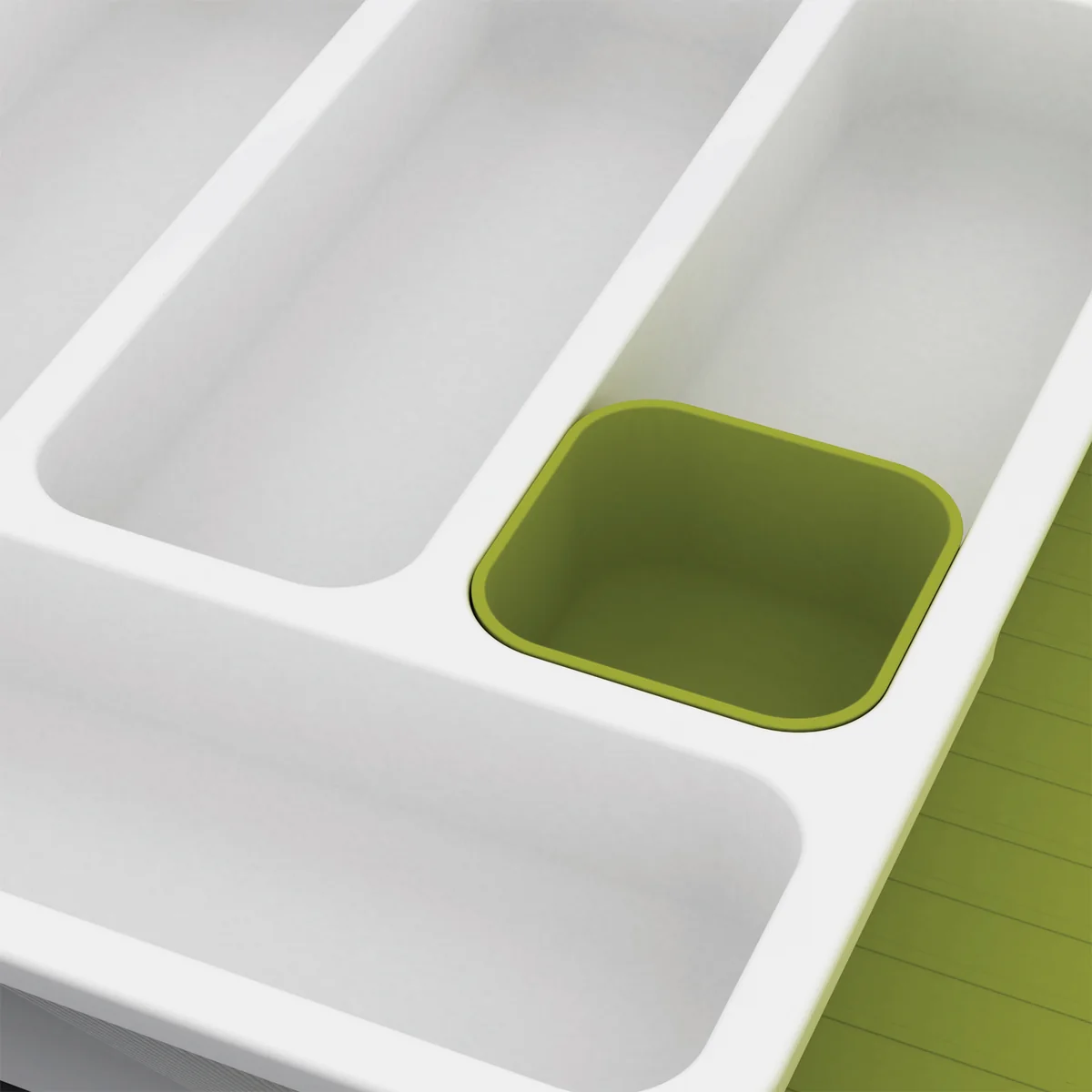 Die beiden Hälften des Küchenhelfers von Joseph Joseph lassen sich auseinanderziehen und können so einer Vielzahl von Schubladen-Grössen angepasst werden. Der ausziehbare Schubladeneinsatz rastet nach der Anpassung einfach und sicher ein. Vier Fächer für Besteck, ein Bereich für grössere Dinge wie Schneidemesser und Schneebesen, und ein herausnehmbares Fach für kleine, lose Gegenstände sorgen für funktionsgerechte Aufbewahrung.