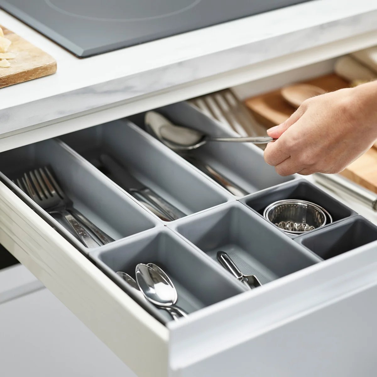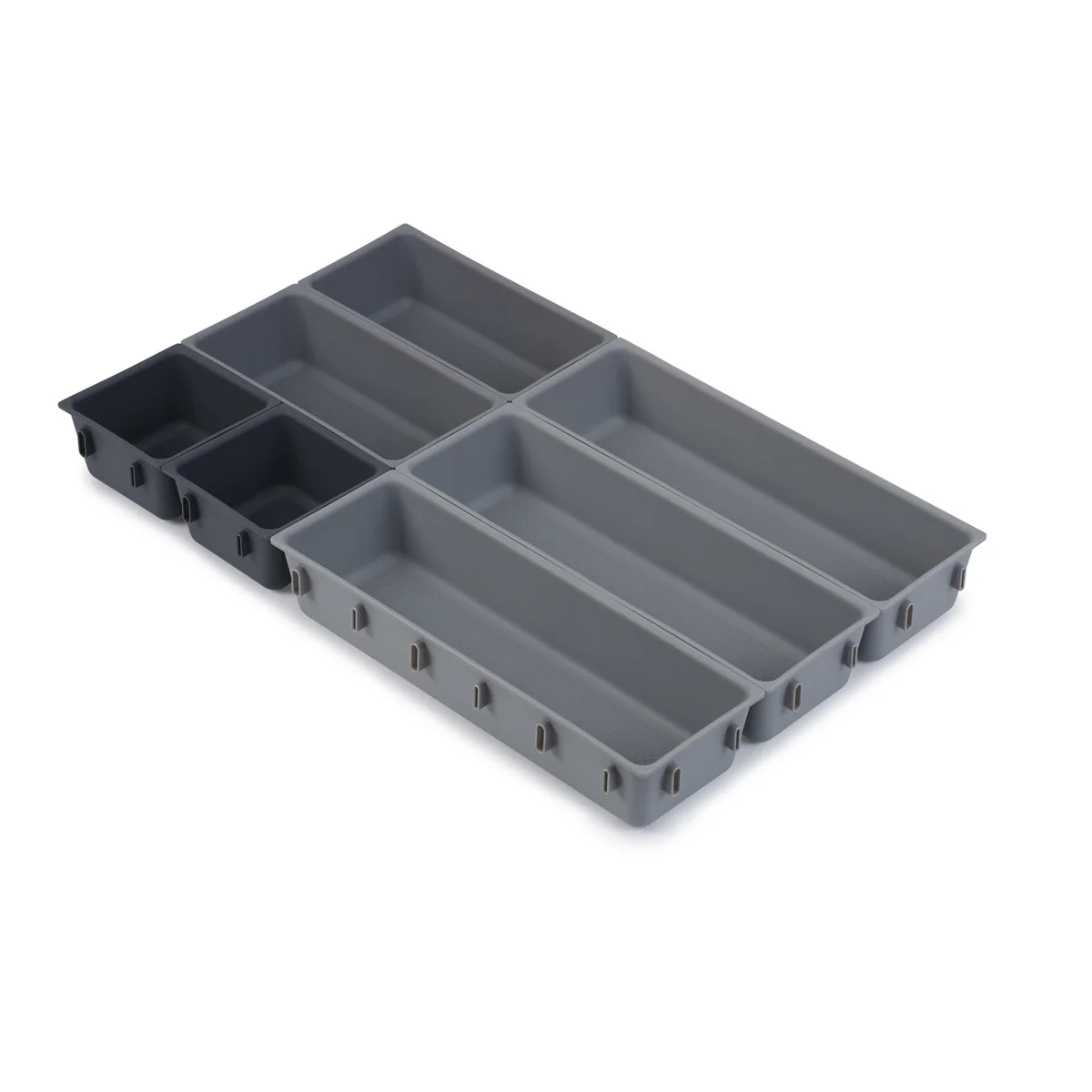 Das Blox Schubladen Organizer Set von Joseph Joseph umfasst unterschiedlich grosse, einzelne Behälter, die sich rundherum zusammenstecken und damit beliebig anordnen lassen, je nach Schubladenplatz. Natürlich können die Fächer auch aufgeteilt und in verschiedenen Schubladen genutzt werden.