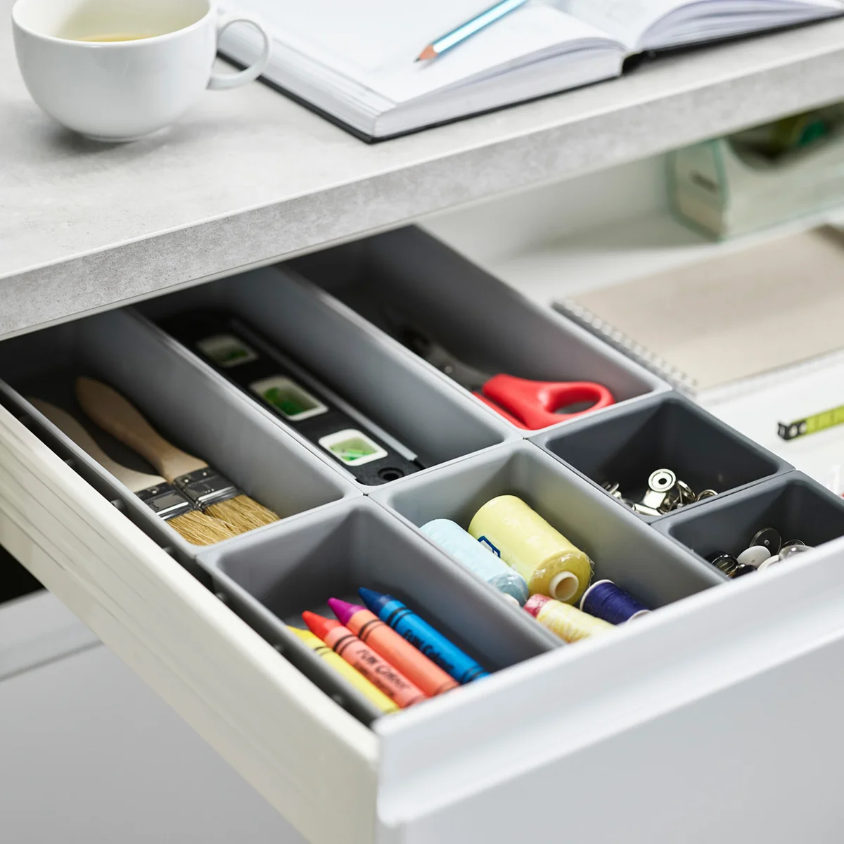 Blox eignet sich perfekt für die organisierte Aufbewahrung vielfältiger Haushaltsgegenstände wie Besteck, Utensilien, Bürobedarf, Werkzeug oder Bastelbedarf. Dank der individuellen Grössenanpassung kann das Set im Schreibtisch genauso wie in der Küchen-Schublade oder der Werkbank verwendet werden.