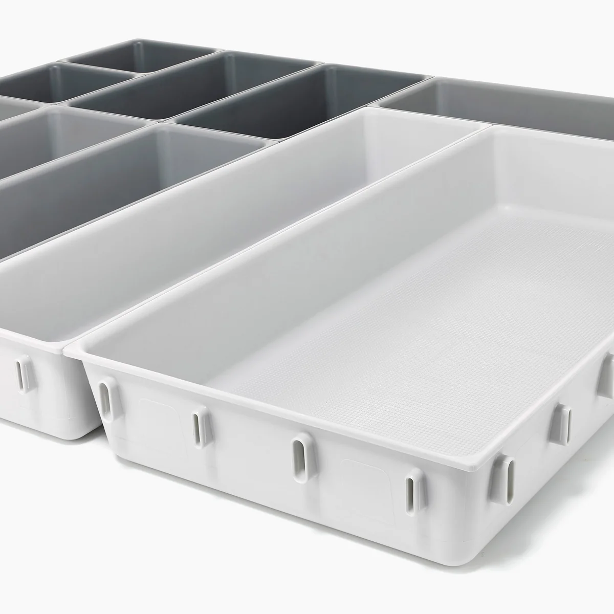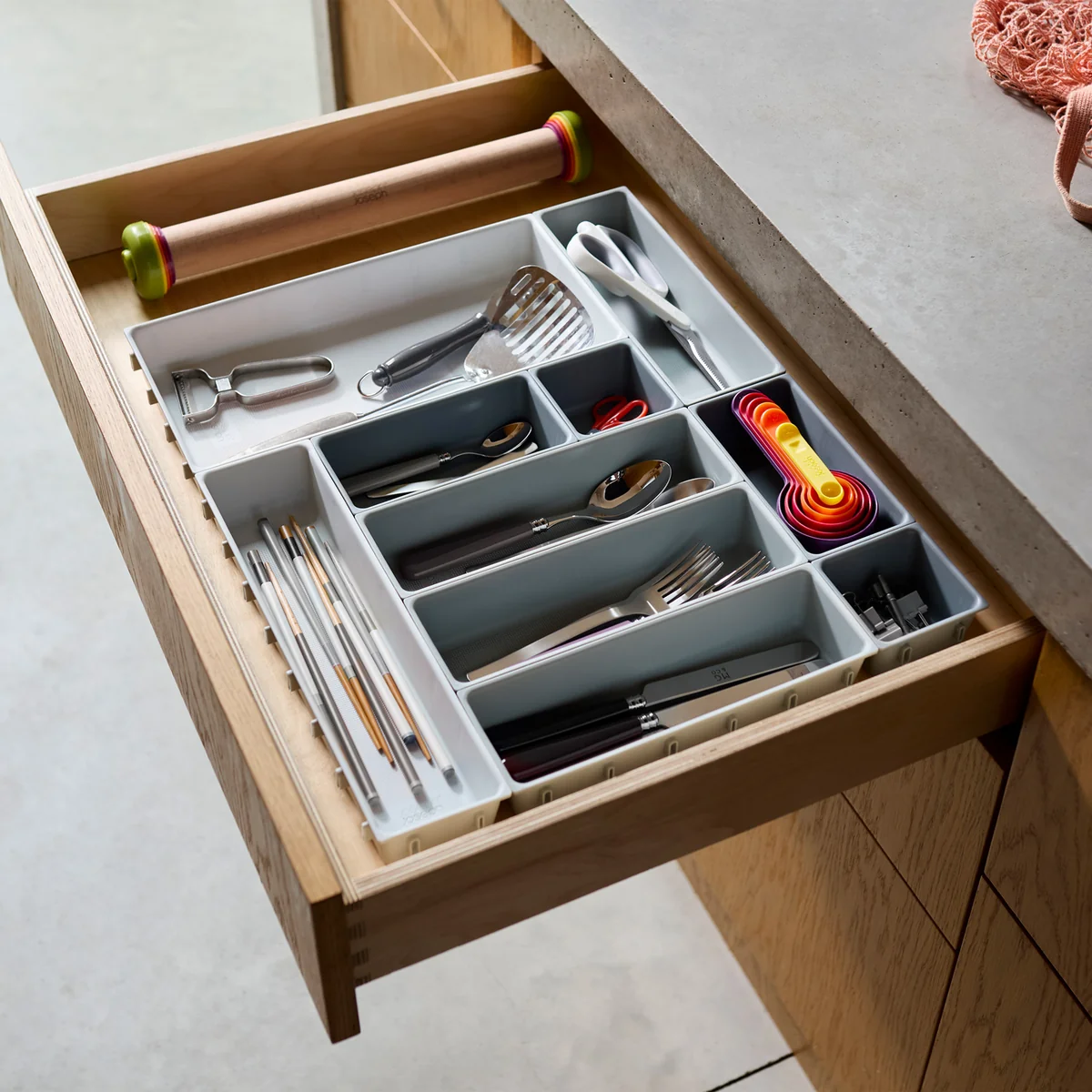 Das Blox Schubladen Organizer Set von Joseph Joseph umfasst unterschiedlich grosse, einzelne Behälter, die sich rundherum zusammenstecken und damit beliebig anordnen lassen, je nach Schubladenplatz. Natürlich können die Fächer auch aufgeteilt und in verschiedenen Schubladen genutzt werden.