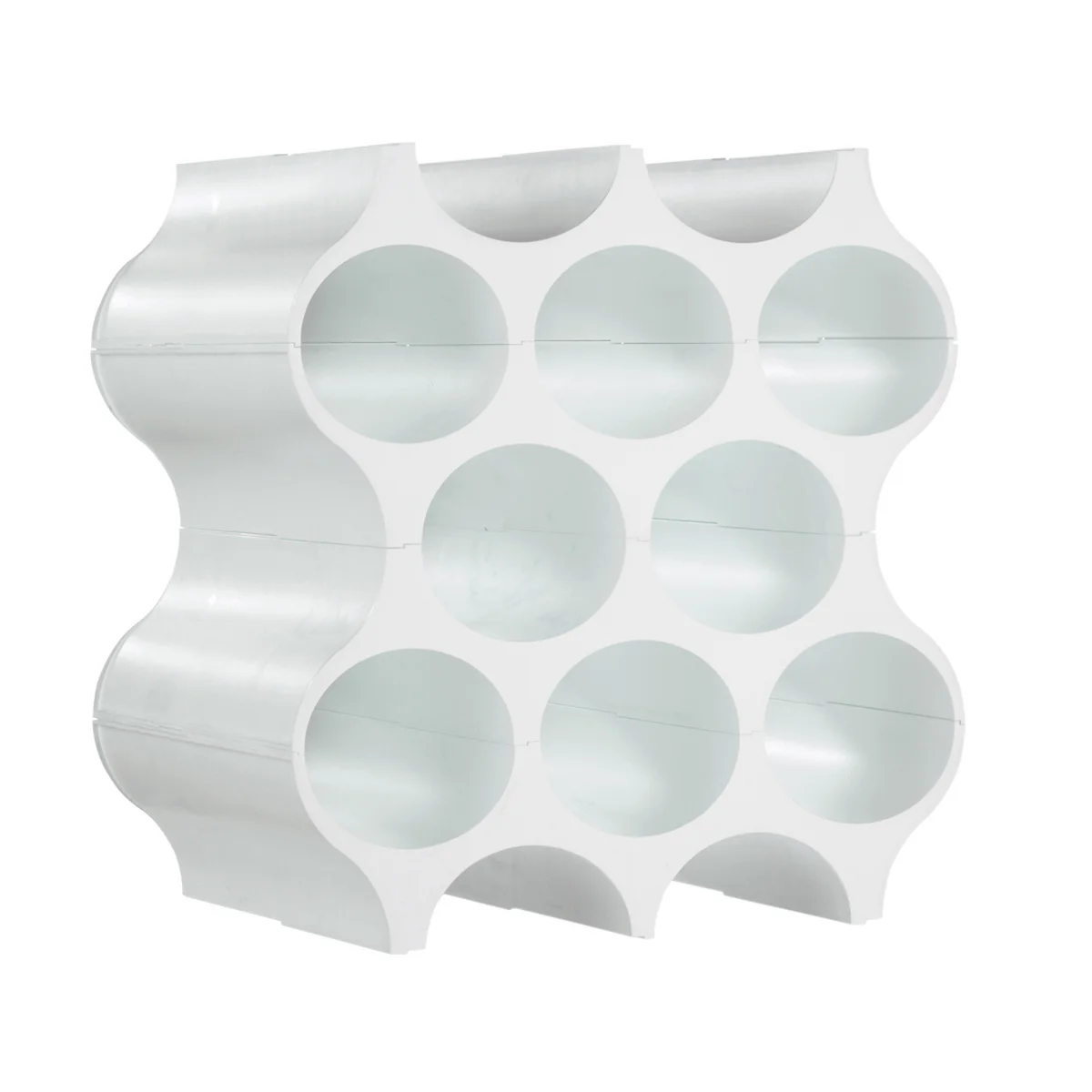 In einem Flaschen-Modul lassen sich insgesamt 10 Flaschen sicher verstauen. Die im Durchmesser 9 cm grossen Öffnungen machen Platz für allerlei Getränkeflaschen für Wein, Bier, Wasser und Limonade. Aber auch Zeitschriften im gerollten Zustand oder kleinere Schuhe wie Ballerinas und Sandalen können in dem Modul-Regal verstaut werden.