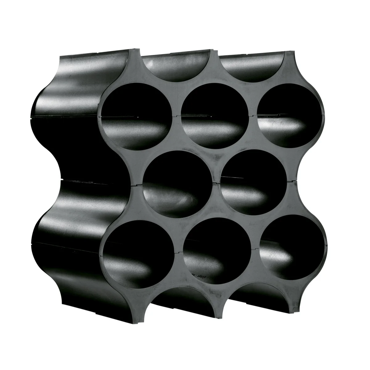 In einem Flaschen-Modul lassen sich insgesamt 10 Flaschen sicher verstauen. Die im Durchmesser 9 cm grossen Öffnungen machen Platz für allerlei Getränkeflaschen für Wein, Bier, Wasser und Limonade. Aber auch Zeitschriften im gerollten Zustand oder kleinere Schuhe wie Ballerinas und Sandalen können in dem Modul-Regal verstaut werden.