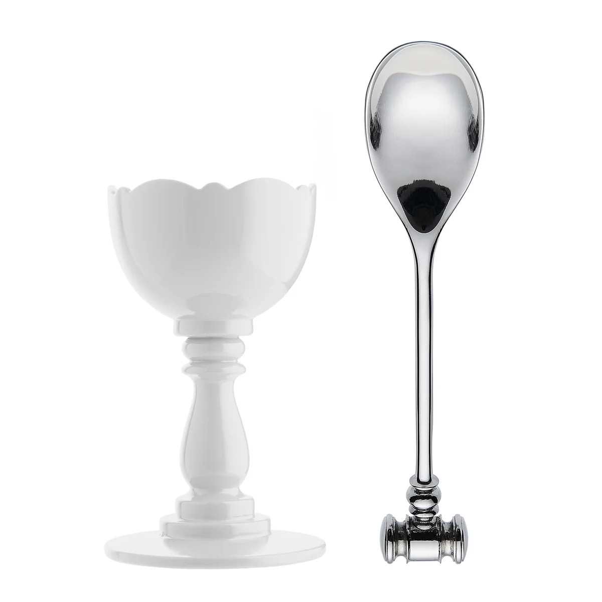 Neben der ausgefallenen Form des Eierbechers selbst, macht der dazugehörige Eierlöffel Dress zu einem Muss für jeden Frühstückstisch. Der Edelstahl-Löffel kommt mit praktischen "Hammer" am Stilende, mit dem die Eierschale einfach aufgeklopft werden kann.