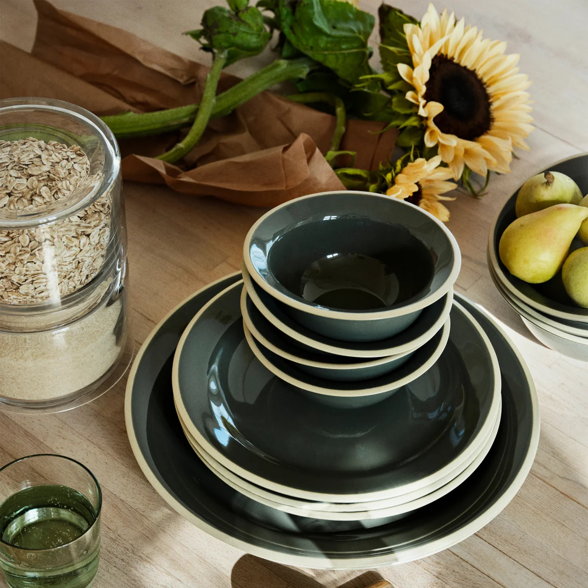 Das sanfte, gedämpfte Grün wird von einem zarten beigen Kontrastrand dekorativ abgerundet und strahlt durch und durch entspannte Eleganz aus. Jedes Stück besteht aus handgefertigtem glasiertem Steingut, das in Portugal hergestellt wird und überzeugt durch seine sorgfältige handwerkliche Verarbeitung und seinen zeitlosen Charme.